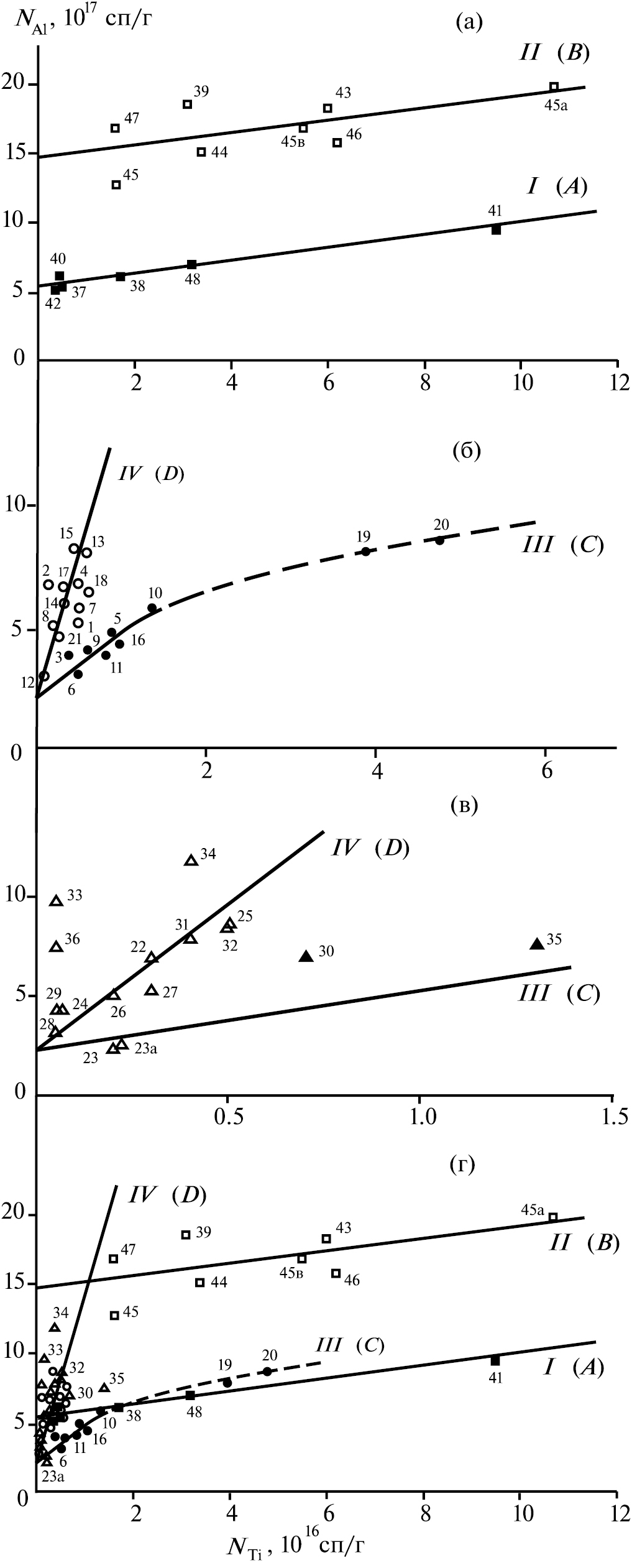 Частичная нелинейность присуща изогенам NGe(NTi) для кварца группы A месторождений Дарасун и Талатуй (кривые I на фиг. 5а и 5в) и изогене NAl(NTi) для кварца той же группы месторождения Дарасун (кривая III на фиг. 4б). Нелинейность проявляется в выполаживании правой части изоген, указывающем на ускорение образования изоморфного Ti по сравнению с Ge.