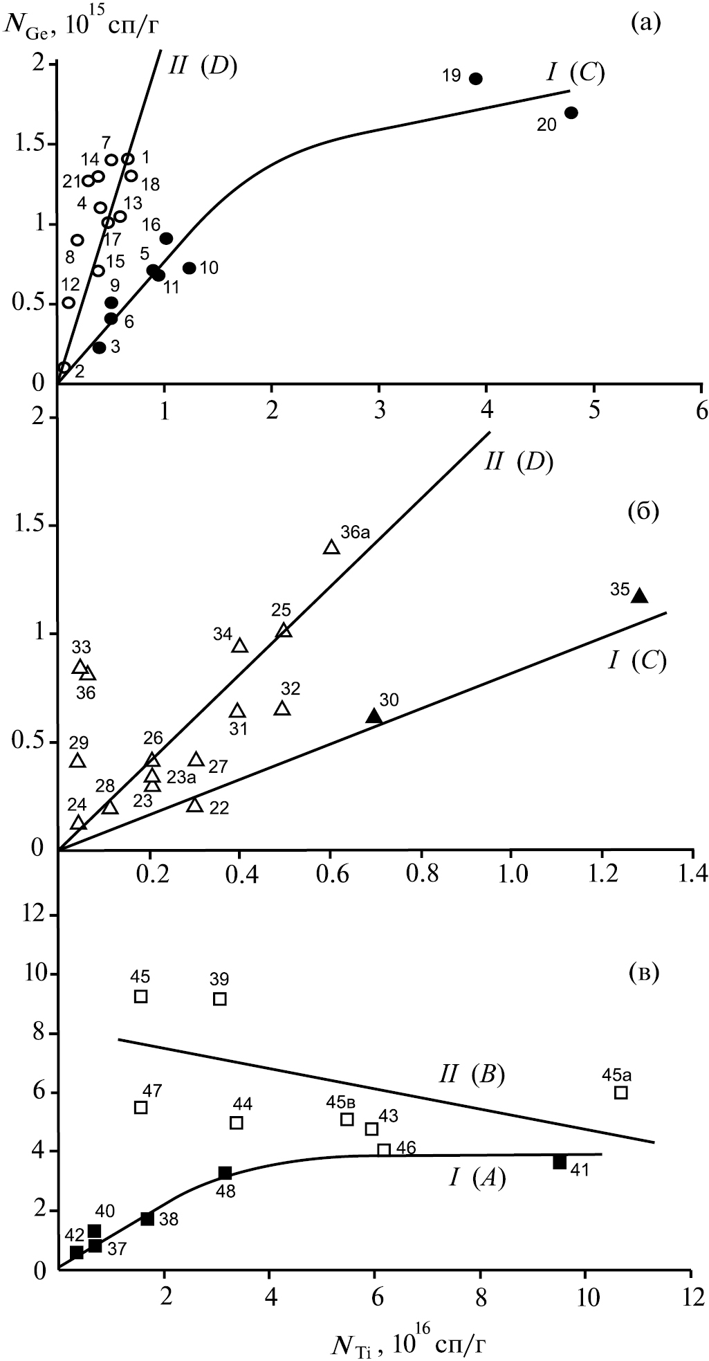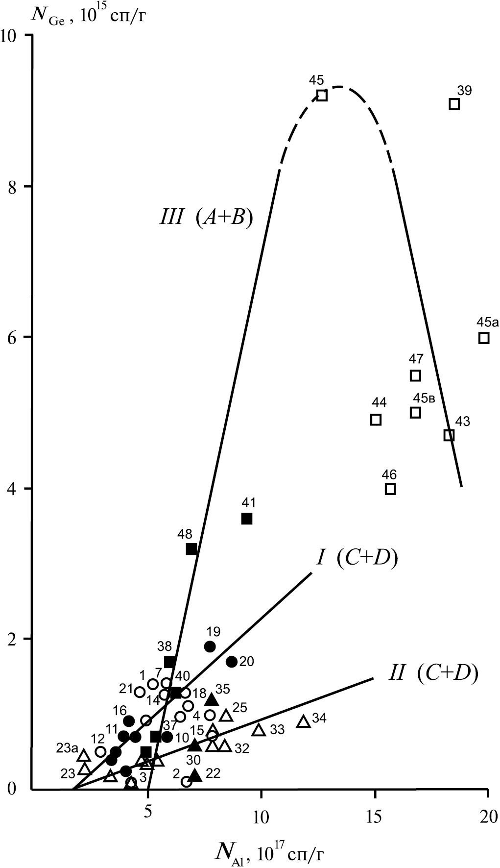 По мере накопления изоморфной примеси Ge начинает проявляться другой канал изоморфизма – механизм замещения. Его реализация приводит к преобразованию изоген NGe(NTi) или NGe(NAl) в прямые линии с отрицательным углом наклона. Появление таких линий отмечается для кварца группы B месторождения Талатуй (изогена II на фиг. 5в и правое крыло изогены III на фиг. 6).