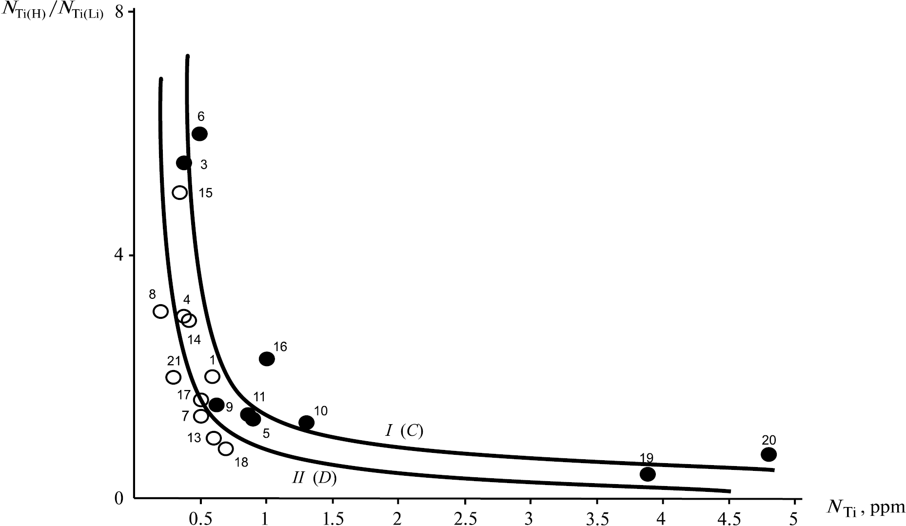 Одним из таких условий считалась степень “открытости-закрытости” систем минералообразования. Для ее оценки использовалось значение относительного содержания в структурных каналах кварца ионов H+ (протонов), принимающих участие в компенсации электрических зарядов Ti- и Ge-центров. Известно, что от других типов ионов-компенсаторов в кварце, Li+ и Na+, протоны отличаются малыми размерами и высокой подвижностью. Поэтому их сохранность в структурных каналах кварца указывает на относительную закрытость системы минералообразования (Гетманская, Раков, 1998). Относительное содержание протонов оценивалось по соотношению NTi(H)/NTi(Li) концентраций Ti-центров с ионами-компенсаторами H+ и Li+.