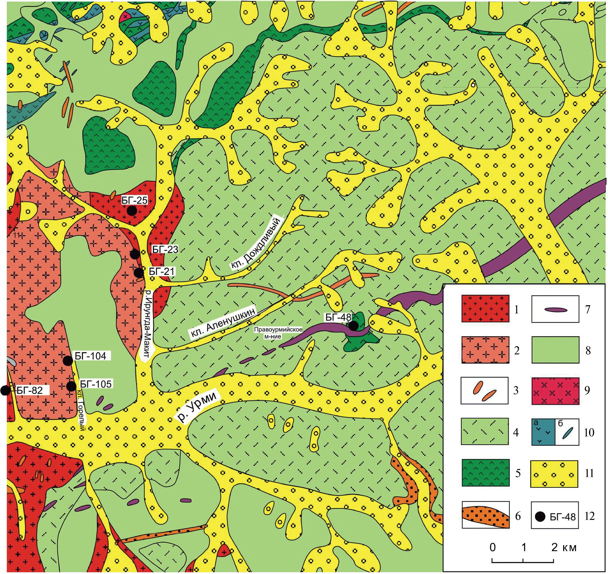 Фиг. 2. Схематическая геологическая карта Верхнеурмийского рудного поля. Cоставлена В.А. Лебедевым (1999) на основе крупномасштабных геологических карт региона и по материалам Комсомольской ГРЭ с авторскими изменениями и добавлениями. 1 – порфировидные граниты Верхнеурмийского массива (эндоконтактовая фация); 2 – биотитовые граниты Верхнеурмийского массива (главная фаза); 3 – дайки лейкократовых с биотитом и мусковитом гранитов (поздняя фаза); 4 – риолиты и риолитовые игнимбриты Урмийского лакколита; 5 – субвулканические риодациты; 6 – субвулканические гранит-порфиры; 7 – Правоурмийская дайка гранит-порфиров и рудная зона; 8 – покровные толщи баджальского комплекса (риолиты, дациты, их туфы); 9 – диоритовые порфириты; 10 – андезиты: межпластовые тела (а) и дайки (б); 11 – аллювиальные и ледниковые четвертичные отложения; 12 – места отбора и номера проб. Номера проб на карте соответствуют их номерам в табл. 1.
