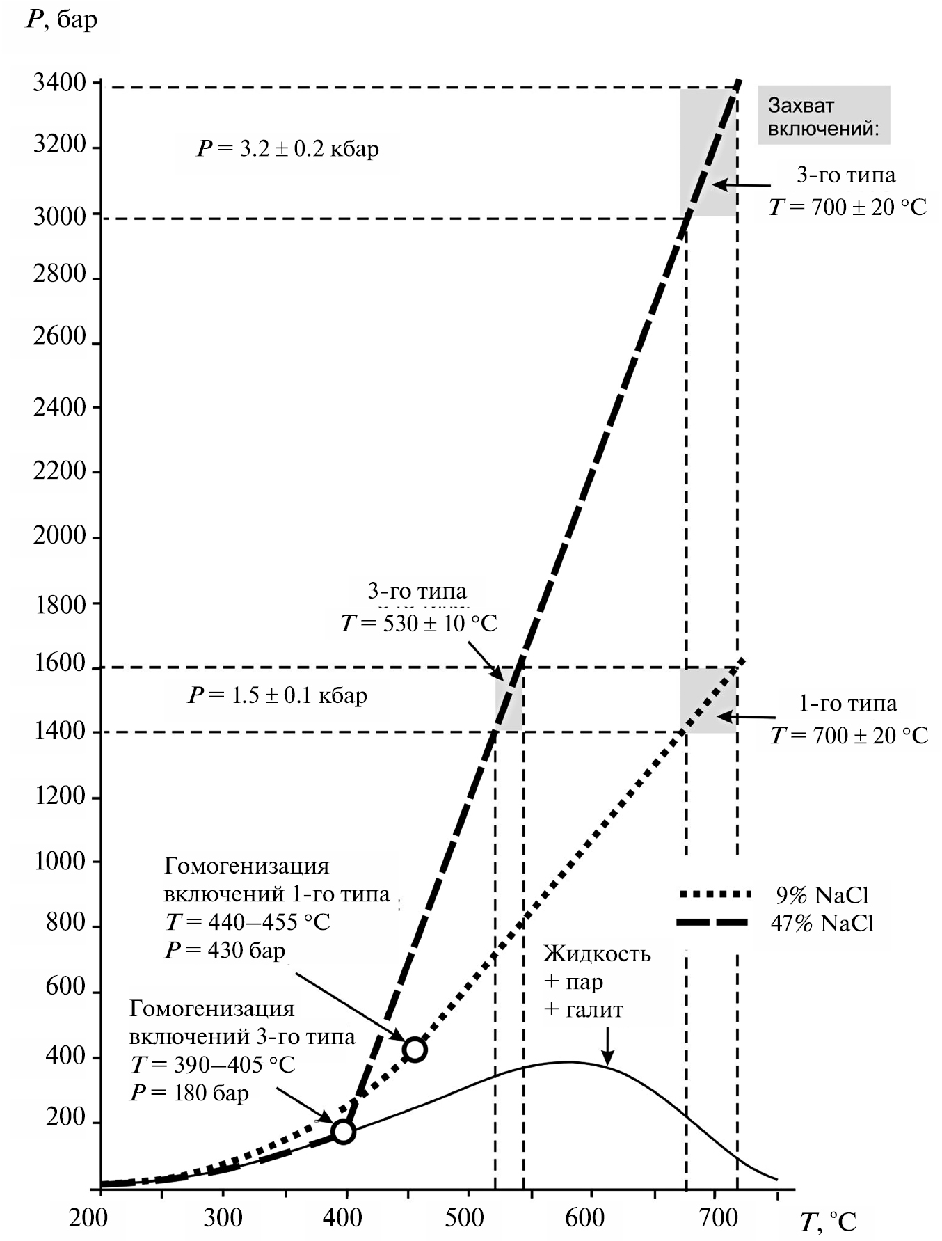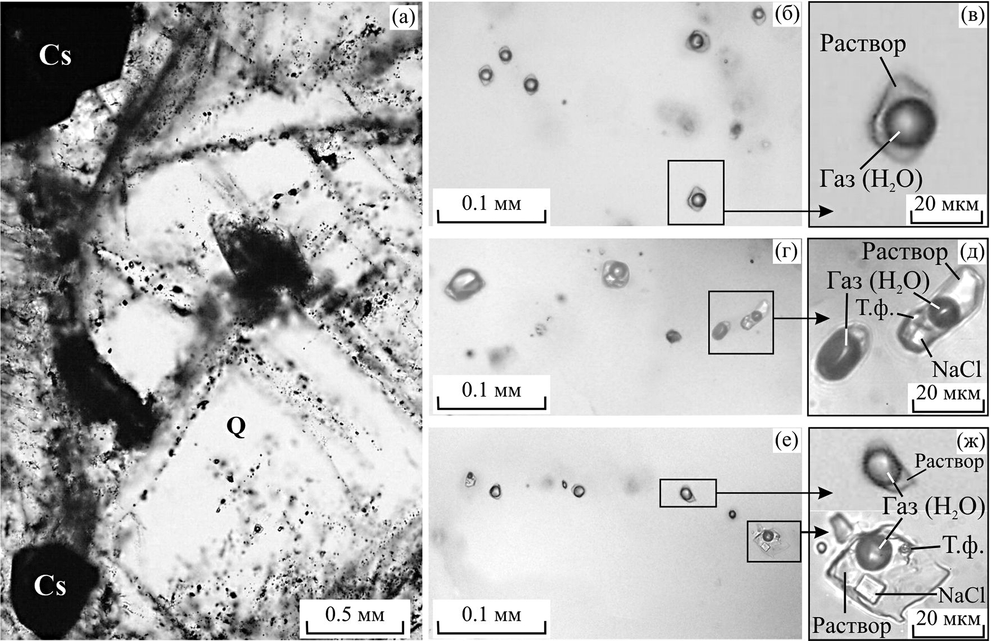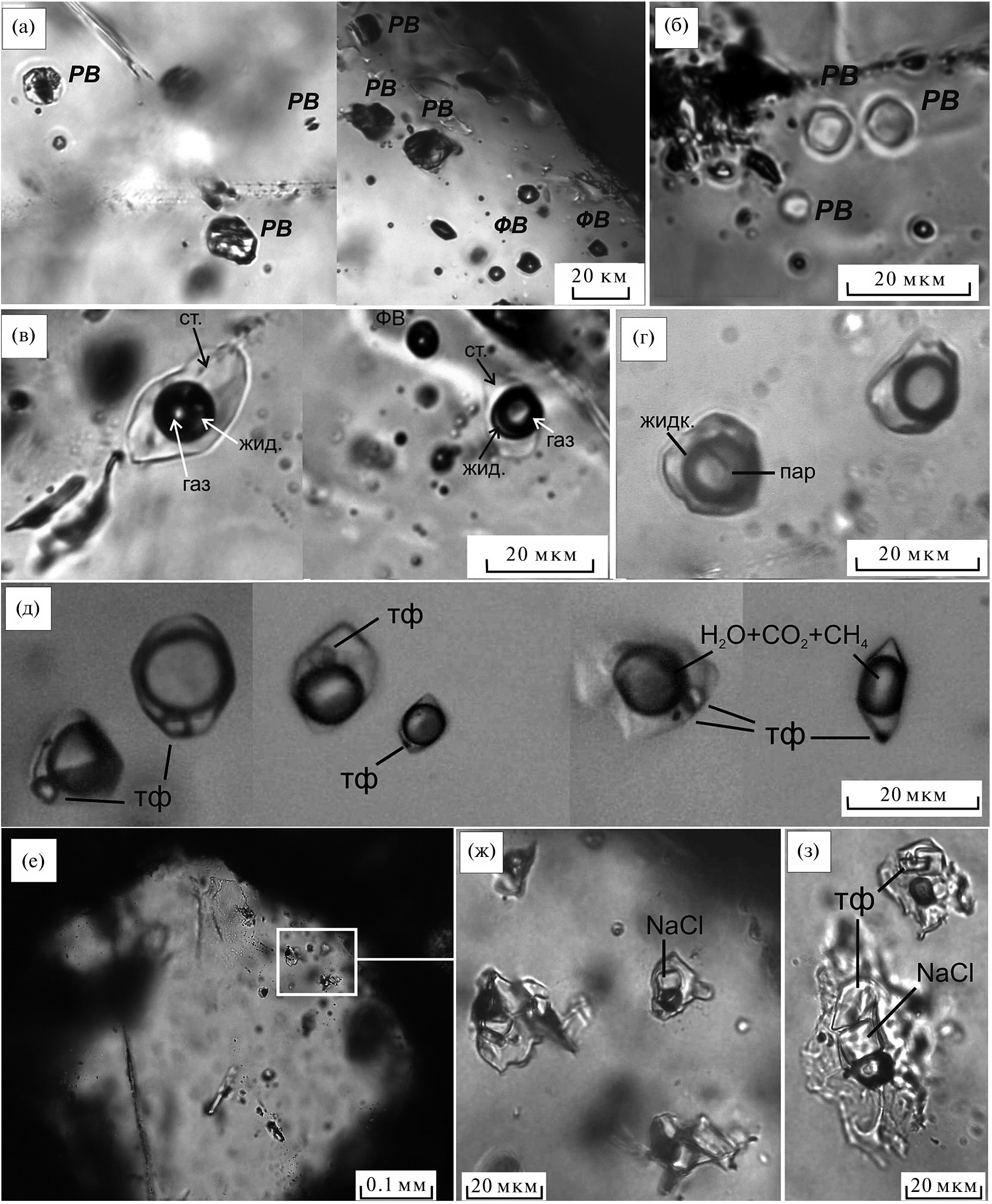 Микротермометрическое изучение флюидных включений провели с помощью термокамеры конструкции ЦНИГРИ, позволяющей выполнять охлаждение и нагревание препаратов от -180 до +650 °C с измерением температуры посредством хромель-алюмелевой термопары. Камеру периодически калибровали при температурах кипения азота (-196 °C) и тройной точки чистой CO2 (-56.6 °C), температурах плавления льда в стандартных растворах NaCl (от -18 до -1 °C), температурах плавления AgNO3 (210 °C), K2CrO7 (398 °C) и NaI (651 °C). Точность измерения температуры плавления льда составляла ± 0.2 °C, температур плавления галита и гомогенизации включений ± 5 °C. При интерпретации результатов использованы экспериментальные и расчетные данные по свойствам системы H2O–NaCl (Реддер, 1987; Sourirajan, Kennedy, 1962; Bodnar, Vityk, 1994; Atkinson 2002; Becker et al. 2008).