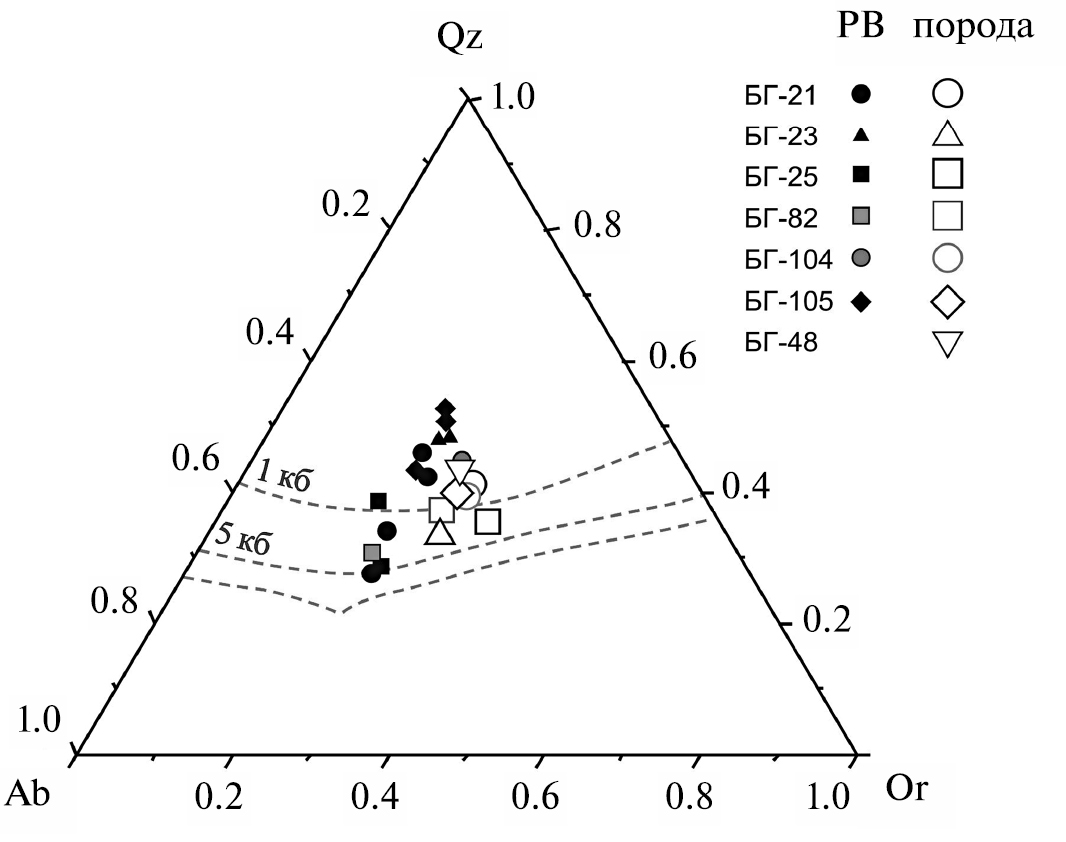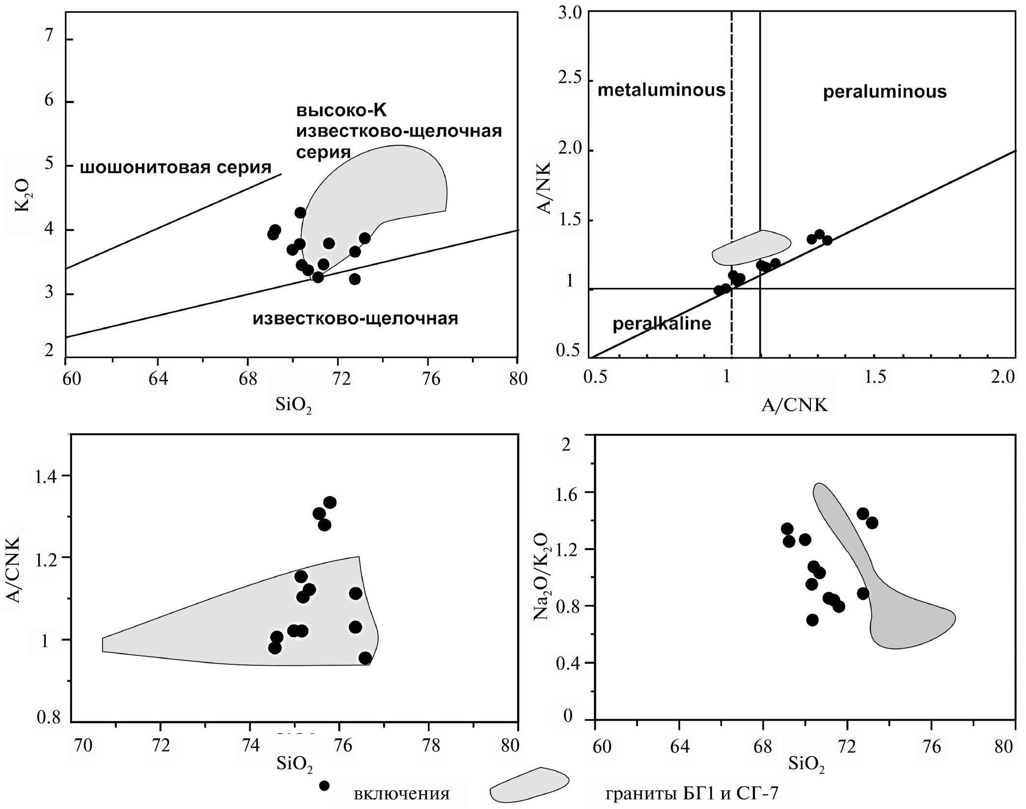 Химический состав магматических пород следующий: содержание SiO2 изменяется от 72.05 до 76.85 мас.%, сумма K2O + Na2O от 7.35 до 8.53 мас.%, CaO – от 0.51 до 2.19 мас.%, K2O в них преобладает над Na2O и FeO – над Fe2O3 (Брусницын и др., 1993; Гоневчук, 2002). Содержание SiO2 в гранитах первой фазы (~73.5 мас.%) ниже, чем в породах второй и третьей фаз (~76.5 мас.%). По соотношению окисного и закисного железа, граниты 1–3 фаз массива являются восстановленными: коэффициент окисленности от 0.35 до 0.45. Это согласуется с наблюдением, что среди акцессорных минералов ильменит преобладает над магнетитом. Исключением стал только покровный риодацит, в котором концентрация SiO2 оказалась ниже – 65.86 мас.% (Брусницын и др., 1993). Таким образом, по химическому составу граниты массива соответствуют аляскитовым гранитам известково-щелочной серии (Гоневчук, 2002). Постепенные переходы между гранитами разного состава позволили рассматривать их комагматичными, последовательными производными единого магматического очага, а некоторые особенности химического (A/CNK от 0.95 до 1.10, преобладание закисного над окисным железом) и минерального составов (присутствие роговой обманки, иногда пироксена в порфировидных биотитовых гранитах и акцессорного граната в биотитовых гранитах главной фазы, преобладание ильменита над магнетитом) указывают на то, что гранитоидам присущи как признаки гранитов типа I, так и гранитов типа S по классификации (Chappel, White, 2001). Это позволило предположить (Гоневчук, 2002), что массив образовался в результате эволюции от гранитов типа I к гранитам типа S и далее к биотитовым лейкократовым гранитам типа А по классификации (Loiselle, Wones, 1979).