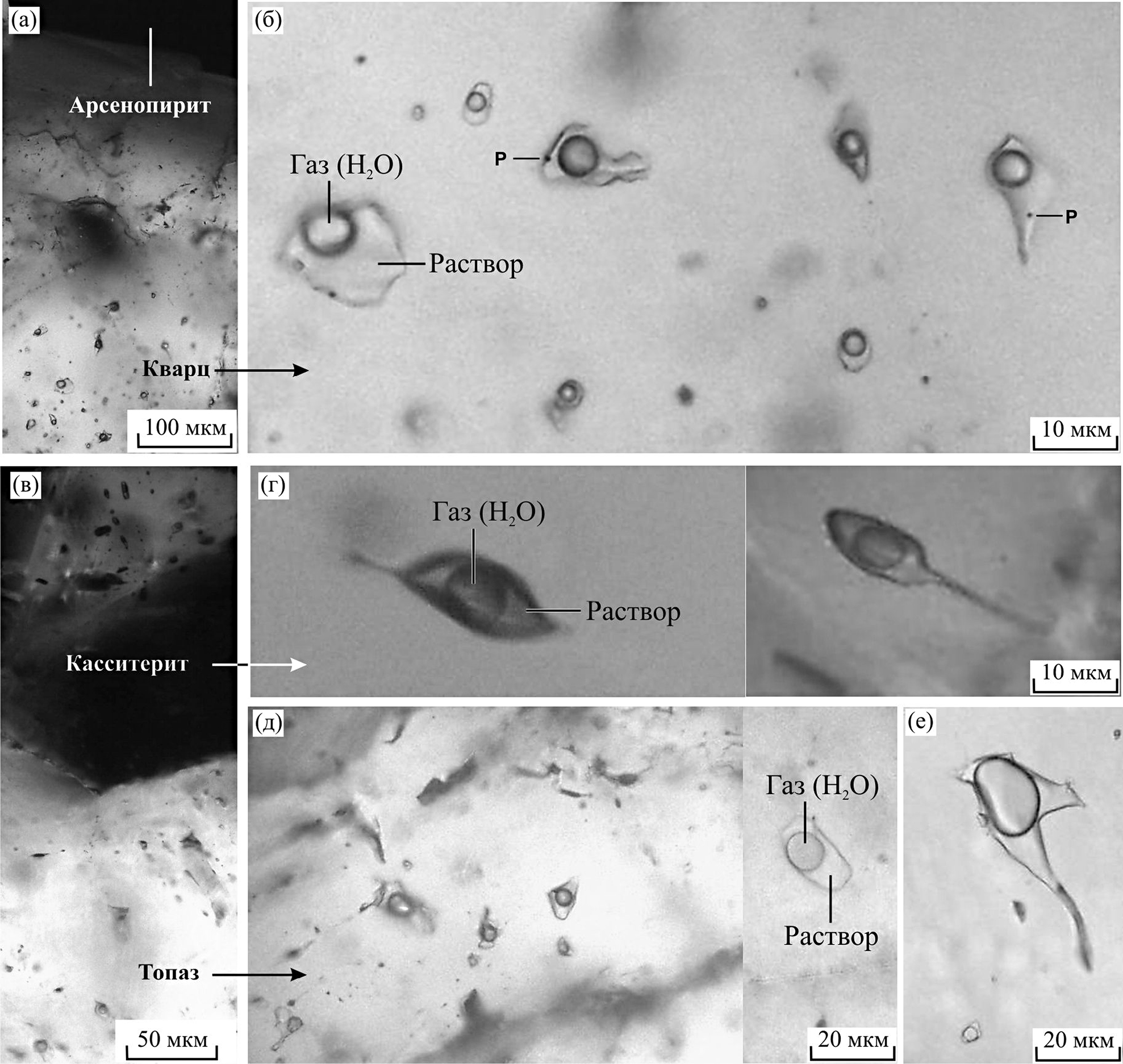 Для исследования индивидуальных включений минералообразующих сред использовались двусторонне-полированные пластинки, изготовленные из гранитов, кварц-касситерит-топазовых и касситерит-кварцевых жил. Из тех же образцов были отобраны фракции +0.25…-0.5 мм для массовых прогревов и исследования составов расплавных включений, а также определения валового химического состава флюидных включений.