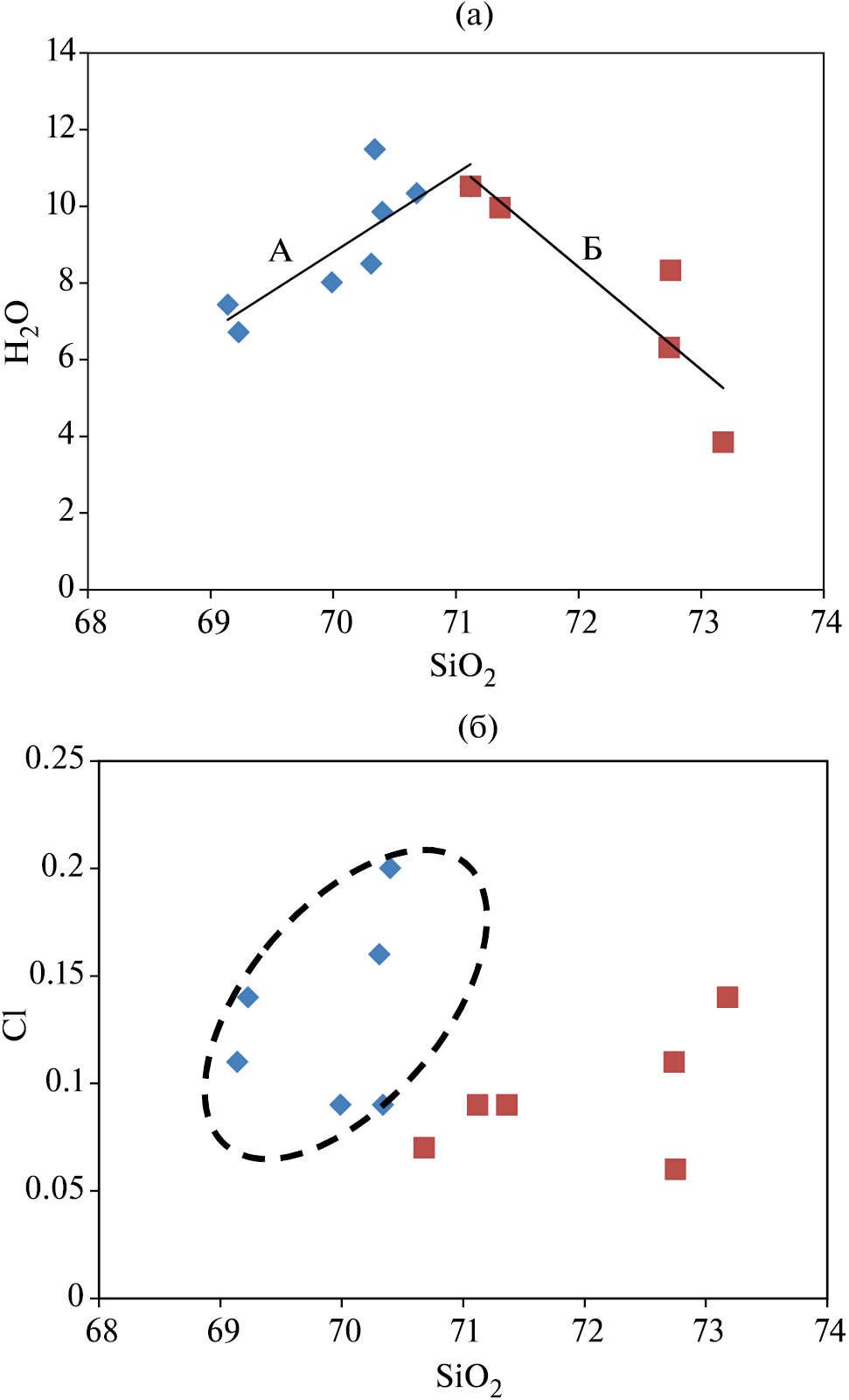 Состав закаленных стекол расплавных включений изучался методом рентгеноспектрального анализа. Размер анализируемых включений редко превышал 15 мкм, что препятствовало использованию метода ВДС в полной мере, поэтому исследование проводилось в два этапа. Сначала выполнялся анализ с помощью сканирующего электронного микроскопа TESCAN Mira 3LMU Inca Energy 450 XMax 80 (Oxford Instruments) при ускоряющем напряжении 20 кэВ и токе зонда 1 нА методом энергодисперсионной спектроскопии (Лаврентьев и др., 2015). Этим методом определялись концентрации главных породообразующих окислов. Для предотвращения потери Na, которая обычно происходит при анализе водосодержащих силикатных стекол (Lineweaver, 1963; Morgan, London, 1996, 2005), анализ выполнялся в режиме сканирования по площади 5 ×5 мкм. После этого определение концентраций второстепенных компонентов, концентрации которых меньше или равны 0.1 мас.%, проводилось методом волно-дисперсионной спектроскопии на электронном микроанализаторе JEOL JXA-8100 с расфокусированным до 5 мкм пучком электронов при ускоряющем напряжении 20 кВ и токе зонда 10 нА. Для калибровки обоих приборов использованы внутрилабораторные стандарты из природных минералов и искусственных веществ, с хорошо охарактеризованными составами. Совместное применение ЭДС- и ВДС-методов рентгеноспектрального микроанализа рассмотрено Лавреньевым и др. (2015).