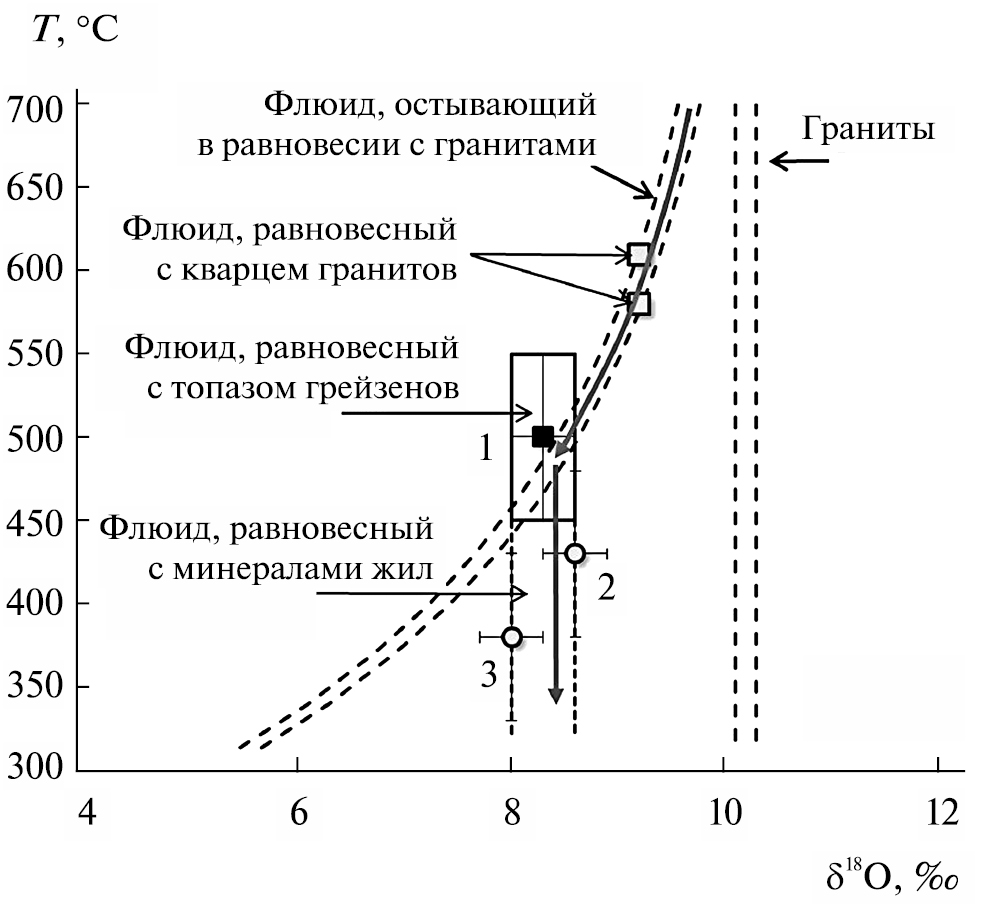 Общепризнанная связь Sn и Sn-W месторождений с гранитоидным магматизмом не снизила остроту дискуссии о составе и происхождении флюидов, образовавших их руды. Исследование флюидных включений и стабильных изотопов показало отличие флюидов в классических оловоносных системах Корнуолл (Великобритания) и Панашкейра (Португалия) от магматических вод (Kelly, Rye, 1979; Marignac, Cathelineau, 2009). Были высказаны гипотезы о метеорном или метаморфическом происхождении флюидов (Kelly, Rye, 1979; Wilkinson, 1990). Предполагалось смешение магматических и метеорных флюидов (Бортников и др., 2005), магматического и метаморфогенного флюидов (Linnen, 1998; Van Daeleet al., 2018), взаимодействие нагретых метеорных вод с вмещающими породами (Polya et al., 2000) и вовлечение мантийного флюида (Burnard, Polya, 2004). Приводились новые свидетельства образования Sn-W руд из магматогенного флюида, отделившегося при кристаллизации кислых магм (Смирнов и др., 2014; Heinrich, 1990). Для вольфрамового месторождения Акчатау (Ц. Казахстан) была предложена модель эволюции рудообразующего флюида, равновесного с гранитами, и рассмотрена роль смены режима изотопного обмена при переходе к грейзеновым и жильным минеральным ассоциациям (Жариков и др., 1992). Эта модель смогла объяснить появление низких величин ä18О флюидной фазы на стадиях формирования рудных жил без участия внешнего флюида. С большой долей уверенности магматогенное происхождение флюида можно считать обоснованным в Sn-W магматогенно-гидротермальных системах, связанных с гранитами Моле в Австралии (Audetat et al., 1998, 2000) и редкометальными гранитами Рудных гор в Германии (Webster, 2004; Rickers et al. 2006). Приведено свидетельство участия магматогенного флюида в образовании Sn-W месторождения Панашкейра (Launay et al., 2018). Обобщение имеющихся данных позволило выдвинуть идею о том, что в природе существуют три типа крайних Sn-W-образующих гидротермальных систем: 1) магматогенно-гидротермальные, 2) высокотемпературные флюидные системы, равновесные с гранитами и 3) высокотемпературные флюидные системы, равновесные с метаморфическими породами (Marignac, Cathelineau, 2009).