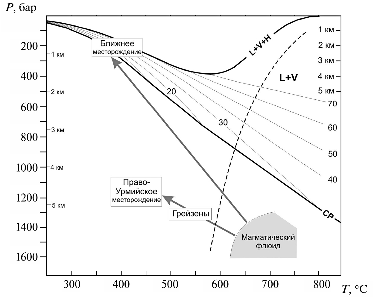 The fluid from which greisens of Pravo-Urmi deposit formed is similar in properties to the supercritical fluid absorbing by magmatic minerals. The salinity of this fluid varying from ~9 to 12 mass.% equiv. NaCl, maximal T = 550 °C (with consideration for the temperature correction of T gom on a pressure ~1 кbar) are similar to such of magmatic fluid, which permit to connect its origin with pluton cooling. The formation of greisens and quartz-topaz veins of Pravo-Urmi deposit is related to fall of temperature of magmatic fluid from 550–450 up to 480–380 °C. The evolution of fluid deposited quartz-cassiterite veins of Blizhnee deposit, which based upon oxygen isotope composition (d18ОН2О ≈ 8.5‰) also separated from magma, was going at more subsurface conditions under much lesser pressure. That led to the gas separation of a fluid with salinity ~13 mass.% equa. NaCl under T = 420–340 °C on thin low salinity vapour and brine with concentration 33.5–37.4 mass.% equiv. NaCl. The research of oxygen isotope system testifies that oxygen isotope composition of ore-forming fluid controlled by equilibrium with granites at wide interval temperatures (from ~700 °С up to the beginning of greisen crystallization). Correspondence of measured and calculation data of the offered model indicates that the considerable volume of external fluid with other isotope characteristics which did not reach the isotope equilibrium with Verkhne-Urmi massif did not come into the magmatic isotope system. The discovered differences of physico-chemical conditions for two studied deposits are not “critical” and support an idea about their formation as the single magmatic-fluid system.