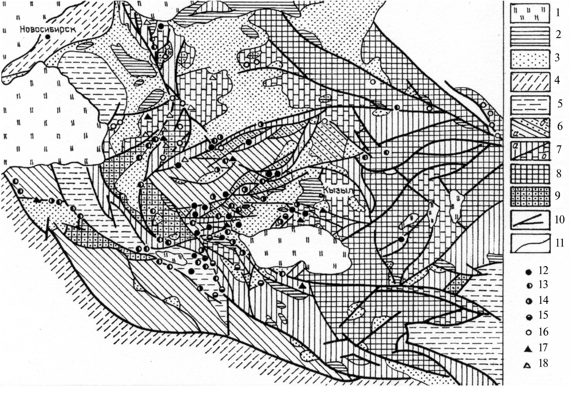 Фиг. 1. Схема размещения месторождений кобальтовых и кобальтсодержащих руд в структурах Алтае-Саянской складчатой области: 1 – отложения кайнозоя; 2 – мезозойские наложенные грабен-синклинали; 3 – терригенно-вулканогенные комплексы среднего–позднего девона и карбона; 4 – структурно-вещественные комплексы герцинид Колывань-Томской, Рудно-Алтайской и Монголо-Алтайской систем; 5 – каледонско-герцинские структурно-вещественные комплексы Салаира, Горного Алтая и Северо-Западной Монголии; 6 – каледонские структурно-вещественные комплексы Западного Саяна, Тувы, Горного Алтая и Северо-Западной Монголии: а) флишоидные формации, б) молассоиды; 7 – салаирские структурно-вещественные комплексы: а) океанические осадочно-вулканогенные, б) островодужные вулканогенно-осадочные; 8 – структурно-вещественные комплексы байкалид Восточного Саяна и Хамардабан-Сангилен-Тарбагатайской складчато-блоковой системы; 9 – выступы байкалид в складчатых сооружениях фанерозоя; 10 – разломы; 11 – геологические границы. Месторождения: 12 – арсенидные никель-кобальтовые; 13 – кобальтовые сульфоарсенидные; 14 – кобальт-медные сульфоарсенидно-сульфосольные; 15 – рудопроявления сульфидно-сульфосольных руд; 16 – кобальтсодержащие объекты неясной формационной принадлежности; 17 – сульфидно-сульфоарсенидные кобальтоносные скарны; 18 – сульфоарсенидно-магнетитовые кобальтоносные скарны.