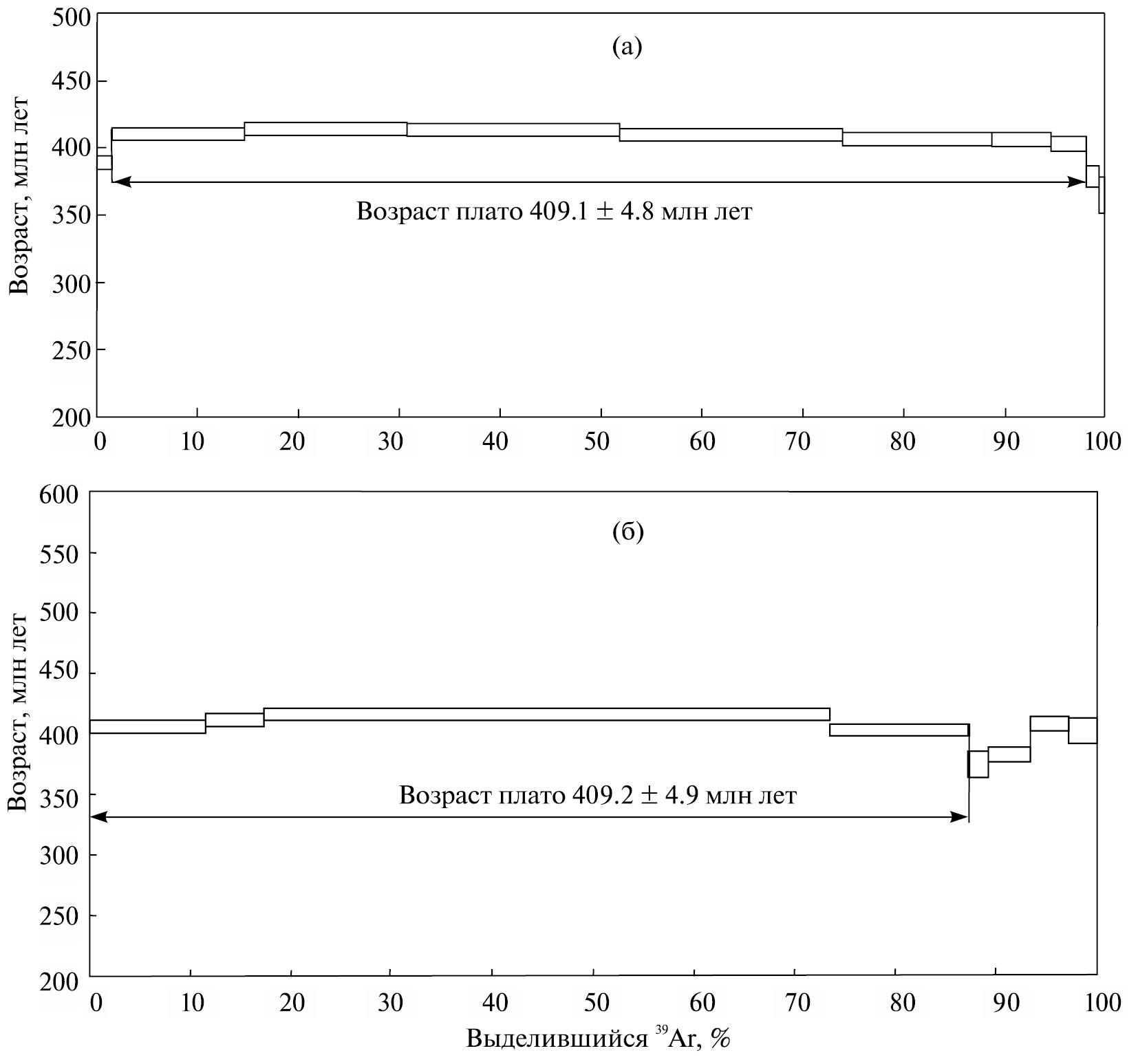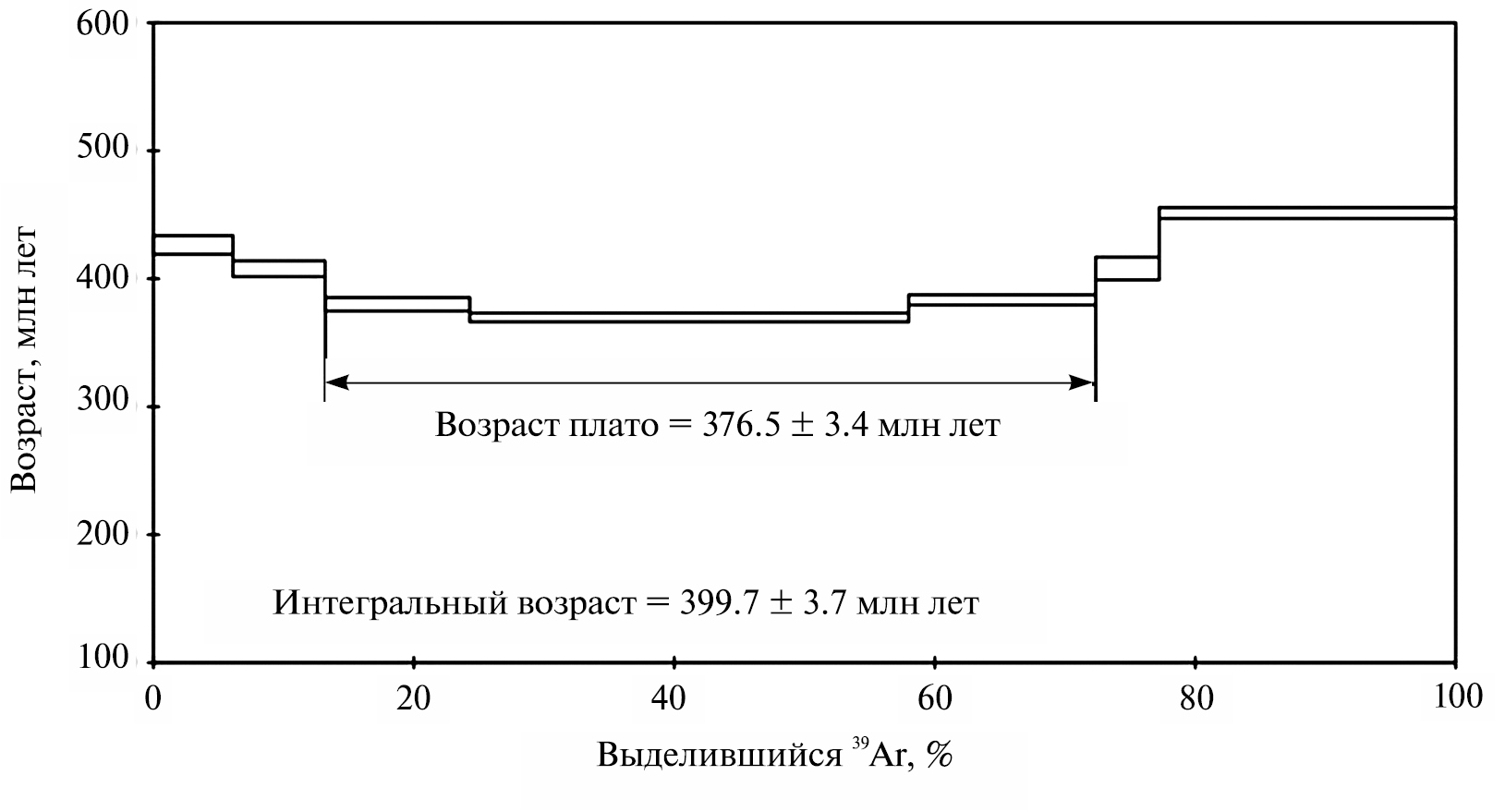 Фиг. 6. Абсолютный возраст (Ar-Ar-метод) роговой обманки из дайки габбро III фазы баянкольского комплекса (D2–3) на участке Тлангара.
