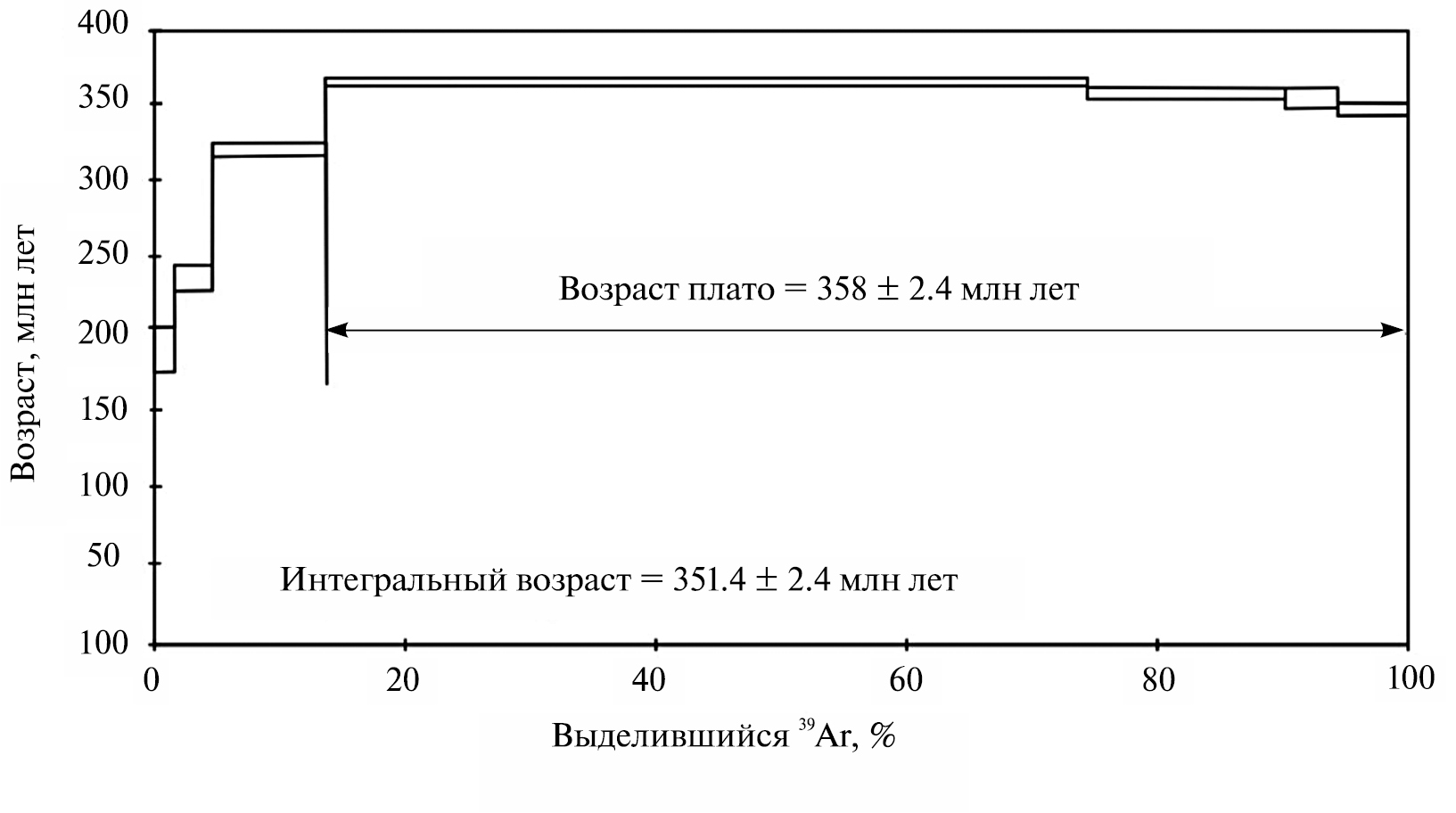 Фиг. 7. Абсолютный возраст (Ar-Ar метод) амфибола из монцодиорита II фазы Эдыгейского массива торгалыкского комплекса (υδ D3–С1tr) на участке Тлангар.