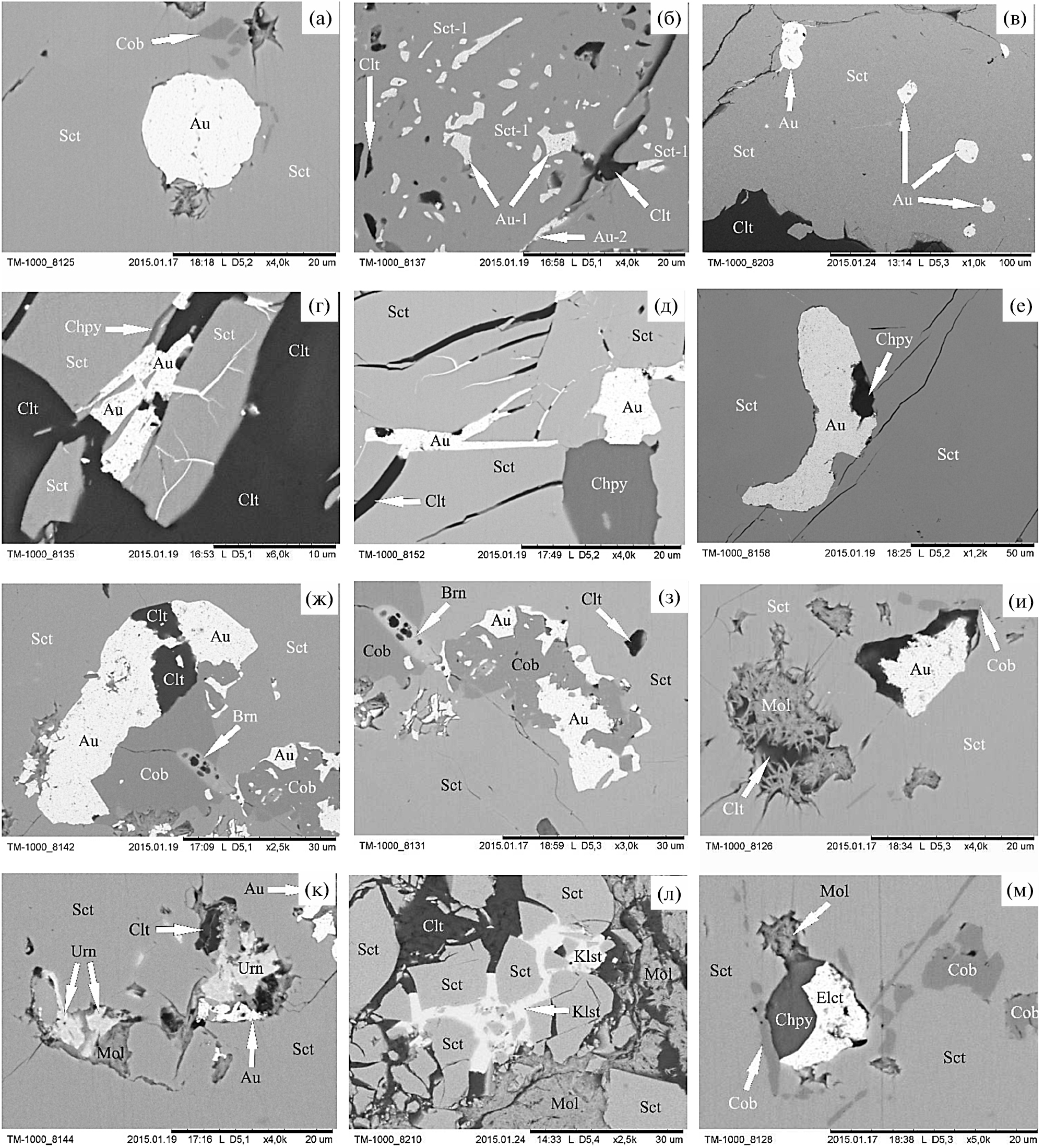 Фиг. 10. Морфология вкраплений самородного золота и электрума в арсенидных парагенезисах кварцево-карбонатных жил структуры Coulloir месторождения BouAzzer Est (527–887 м). а – самородное золото в скуттерудите; б – самородное золото в скуттерудите с просечками хлорита; в – самородное золото в скуттерудите; г – самородное золото в хлорите, цементирующем брекчию скуттерудита; д – самородное золото в скуттерудит-халькопиритовом парагенезисе; е – самородное золото с халькопиритом в скуттерудите; ж – самородное золото в скуттерудит-кобальтин-халькопиритовом парагенезисе; з – самородное золото в реликтовом обособлении кобальтина, замещенного скуттерудитом; и – самородное золото и молибденит в хлорите среди скуттерудита; к – самородное золото и уранинит в хлорите среди скуттерудита; л – клаусталит в брекчии скуттерудита, сцементированного хлоритом; м – электрум с халькопиритом и молибденитом в скуттерудите с реликтами кобальтина. Сокращения названий минералов: кобальтин – Cob, скуттерудит – Sct, хлорит – Clt, самородное золото – Au, электрум – Ekt, халькопирит – Chpy, молибденит – Mol, браннерит – Brn, клаусталит – Klst, уранит – Urn. Фотографии вкраплений золота и электрума выполнены на электронном микроскопе Tashiba-TM-1000 в ТувИКОПР СО РАН (аналитик Е.Н. Тимошенко).