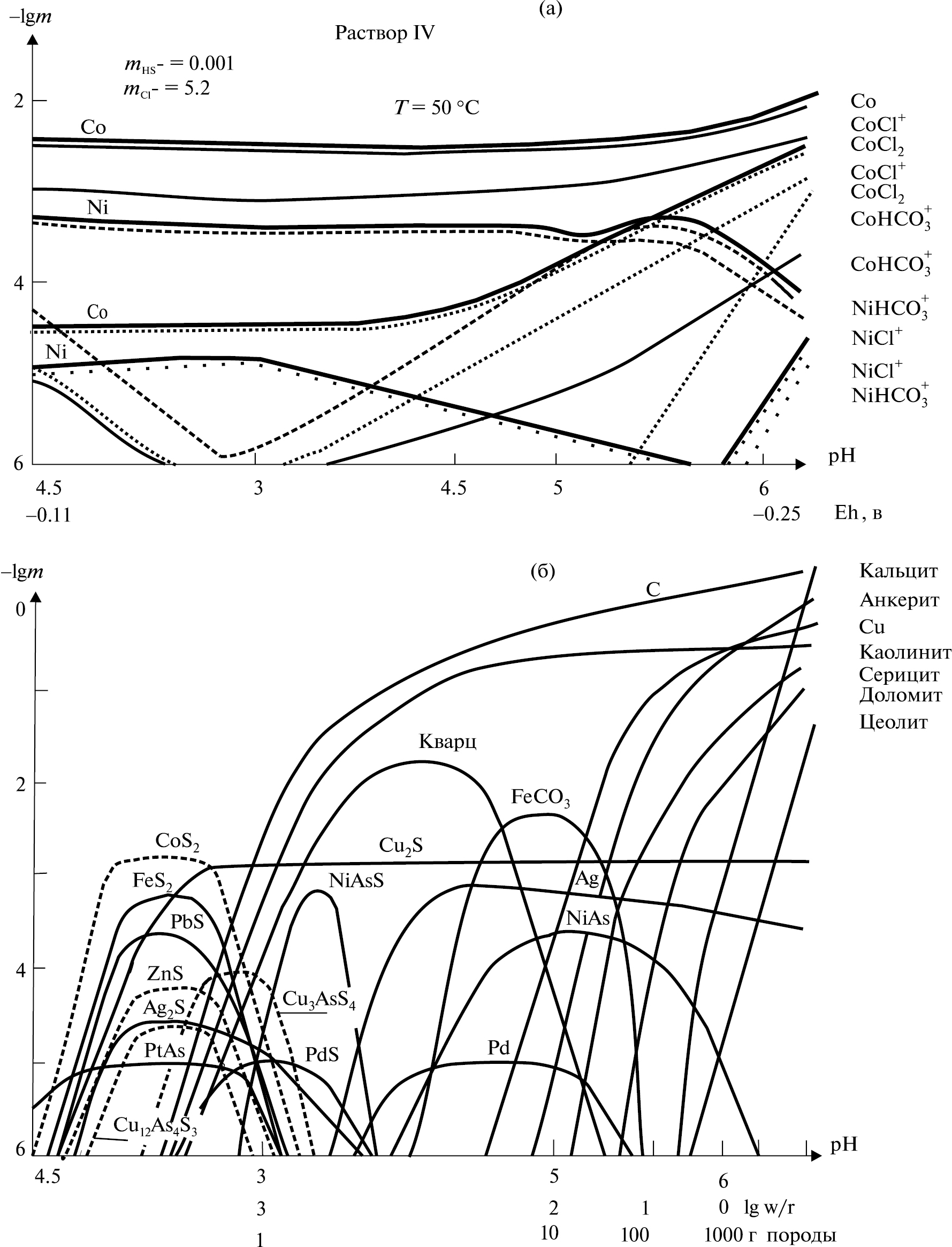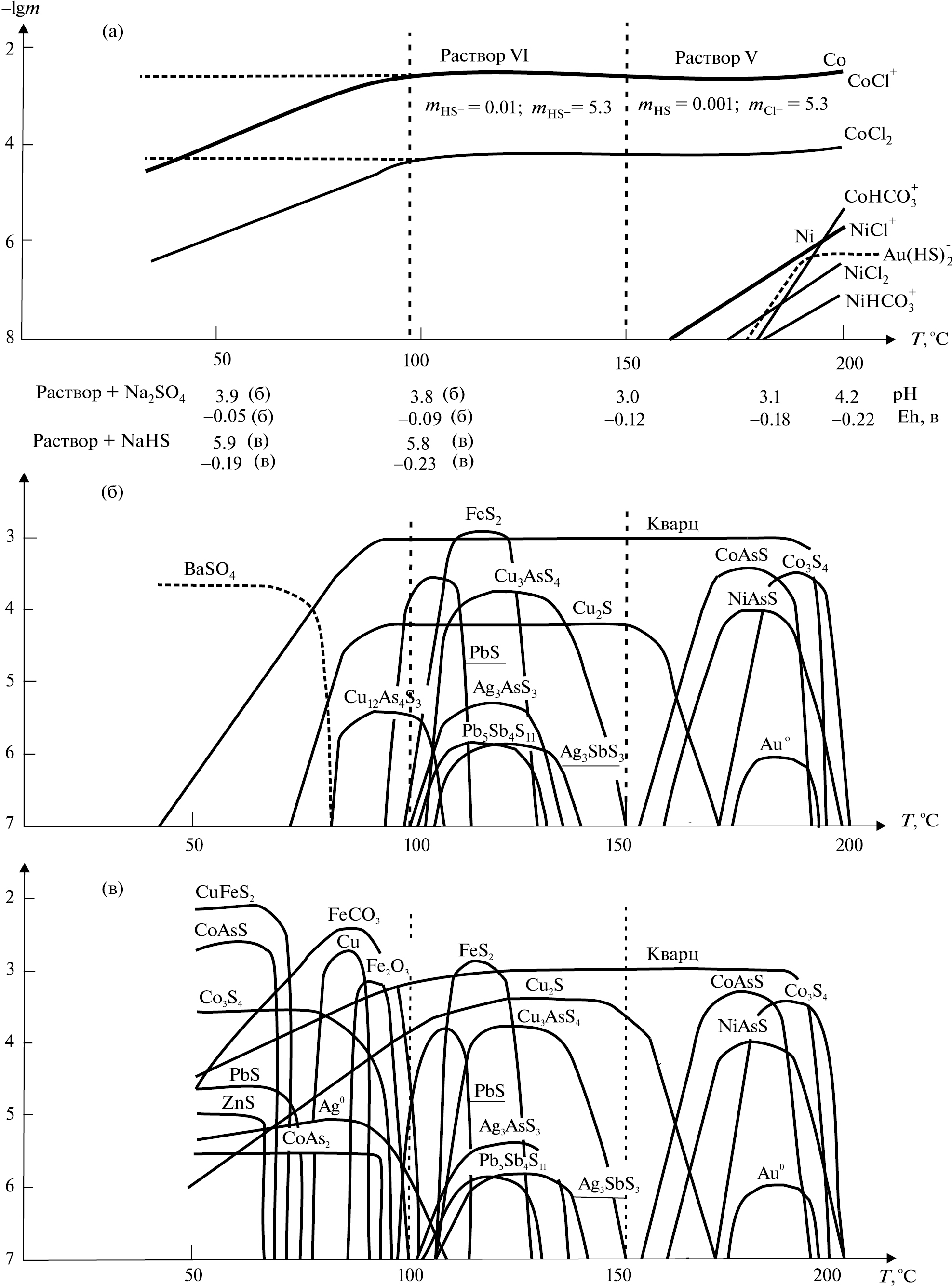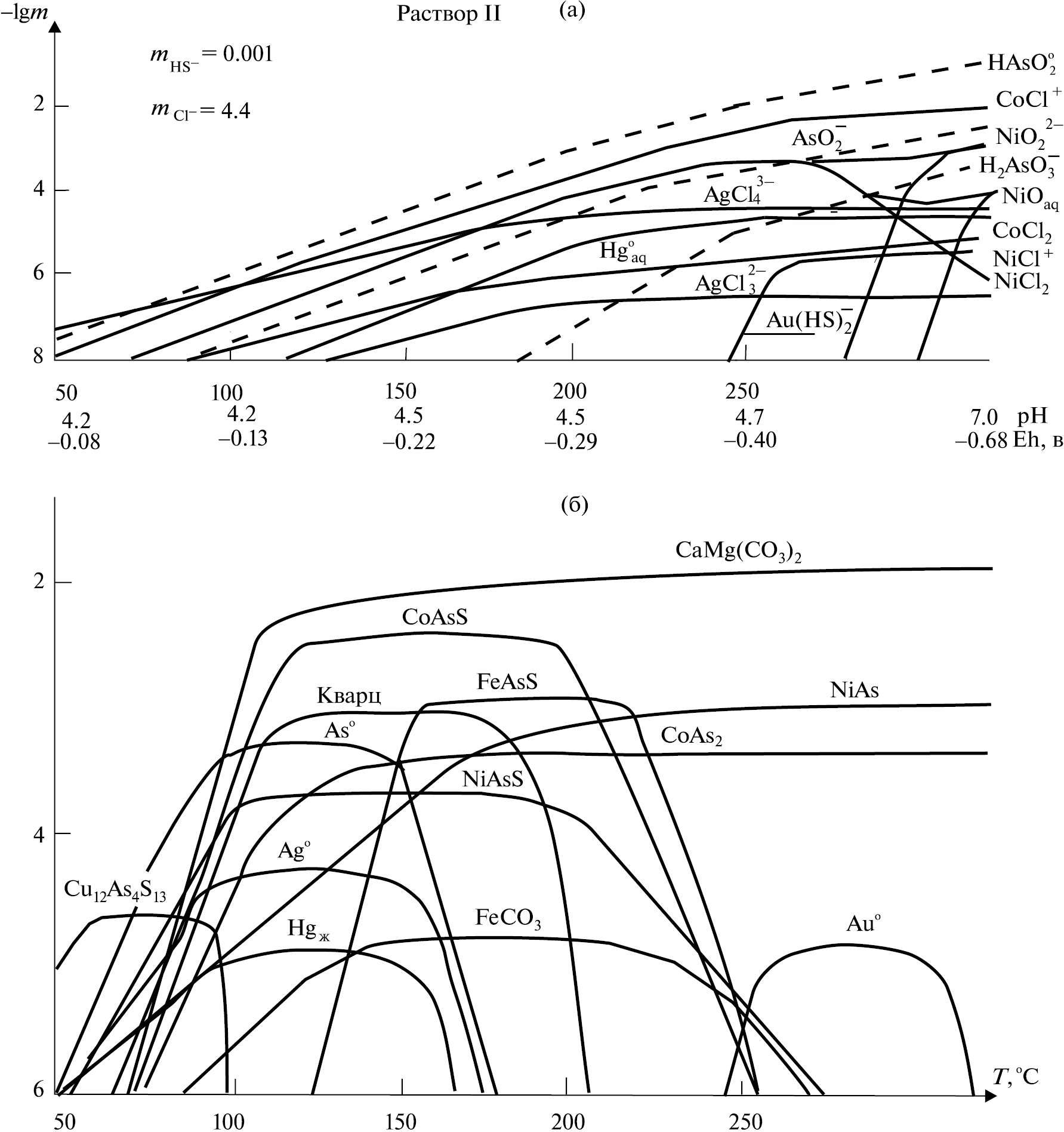 Приведенные выше результаты многочисленных исследований послужили теоретической основой исследования, главной задачей которого являлось термодинамическое моделирование условий совместного переноса и отложения Au, Co, Ni, Ag и др. рудных элементов и расчет ряда равновесных состояний гидротермальной системы, по составу близкой к природным рудообразующим системам кобальтовых месторождений (Co-As, Ni-Co-As и Cu-Co-As). Для термодинамического моделирования и построения физико-химических моделей рудообразования на Au-Ag, Ag-Sb, Hg, Hg-Sb и Au-Sb месторождениях ранее авторами использовались программные пакеты Селектор и Chiller (Павлова и др., 2004; Оболенский и др., 2006, 2007, 2009, 2011; Павлова, Боровиков, 2008). Результаты изучения природы углекислых мышьяковистых вод и их рудообразующей роли, термодинамического анализа равновесий в гидротермальных системах {As(III)-S(II)-O-H; Sb(III)-S(II)-O-H; Cu-Ag-AuS-O-H}, экспериментальных исследований по согласованию термодинамических данных в водных системах в интервале температур 0–600 °С опубликованы в работах Н.Н. Акинфиева с коллегами (Акинфиев и др., 1992, 1993; Zotov et al., 2003; Акинфиев, Зотов, 2010; Tagirov et al., 2013). С.Р. Крайновым с соавторами (2007) для систем “порода – углекислая вода” были рассчитаны миграционные формы As и показано, что преобладающими являются кислородные формы мышьяка (HAsO20 и AsO2-). Изменение Eh и кислотно-щелочных условий среды приводит только к трансформациям этих химических форм, поэтому HAsO20 является доминирующей формой As в кислых и близнейтральных углекислых водах с повышенными значениями Eh, а AsO2- в малоуглекислых щелочных водах с низкими Eh.