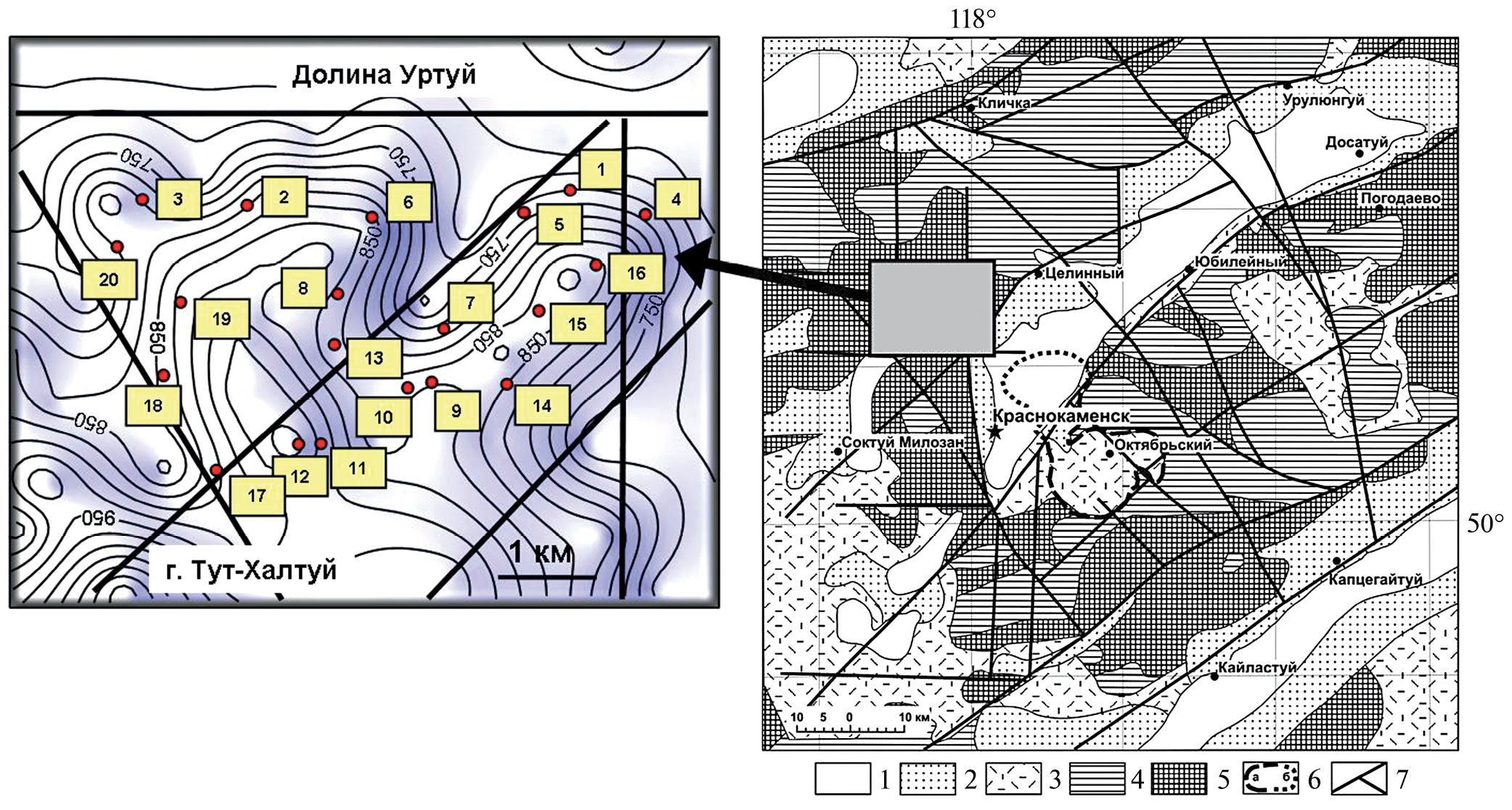 Фиг. 1. Справа – положение Стрельцовской рудовмещающей кальдеры в региональных геологических структурах Юго-Восточного Забайкалья. 1 – неоген-четвертичные осадки; 2 – раннемеловые осадочно-вулканогенные комплексы; 3 – дораннемеловые вулканогенно-осадочные комплексы; 4 – палеозойские интрузивные гранитные комплексы; 5 – архей-протерозойские и раннепалеозойские гранито-гнейсы и комплексы магматических пород; 6 – Стрельцовская кальдера, обрамленная установленными (а) и предполагаемыми (б) кальдерообразующими разломами; 7 – зоны региональных глубинных разломов. Серый прямоугольник показывает расположение УГМ в северо-западном обрамлении кальдеры. Слева – расположение участков (точки 1–20) изучения трещиноватости и отбора ориентированных в пространстве образцов пород. Показаны зоны основных разломов и изолинии высот в пределах УГМ.