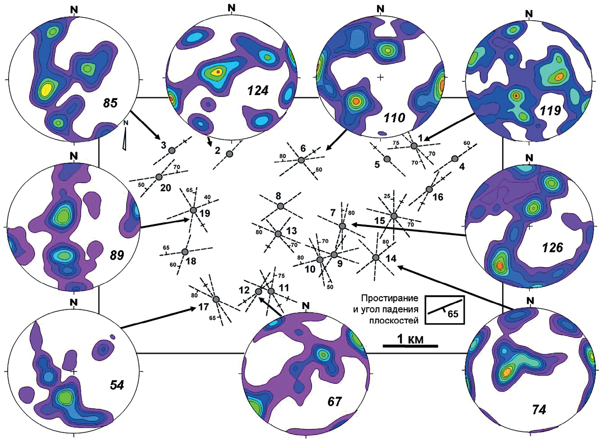 Фиг. 2. Стереограммы распределения узлов пересечения плоскостей трещин (нижняя полусфера, программа StereoNet3.03) в породах УГМ. Цифрами указано количество изученных на базовой точке трещин.