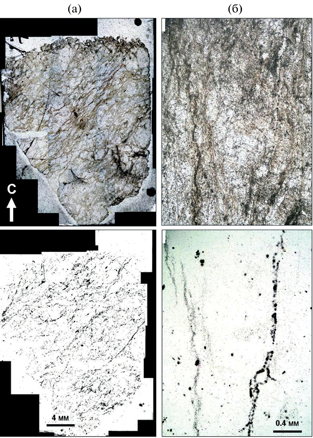 Фиг. 3. Характер распределения урана в ориентированных в пространстве (С – север) шлифах (вверху), установленный методом осколковой радиографии (внизу). а) в «бластомилонитовом» ядре зоны рассланцевания северо-восточной – юго-западной ориентировки (Т 17) распределение урансодержащих минералов связано с линейными дислокациями. Концентрации урана достигают 14 ppm; б) на удалении от зоны рассланцевания (Т 19) накопление урана (до 15 ppm) связано, в основном, с оксигидроксидами Fe, Ti и Mn, выполняющими полости трещин. Содержания урана приведены по данным ICP-MS (CRPG, Нанси, Франция).
