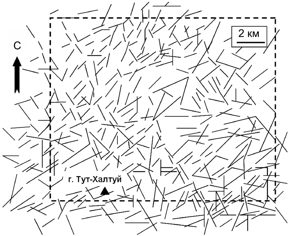 Фиг. 4. Структурный каркас линеаментов УГМ, реконструированный по космическим снимкам территории. Прямоугольником показана площадь детального изучения макротрещиноватости.