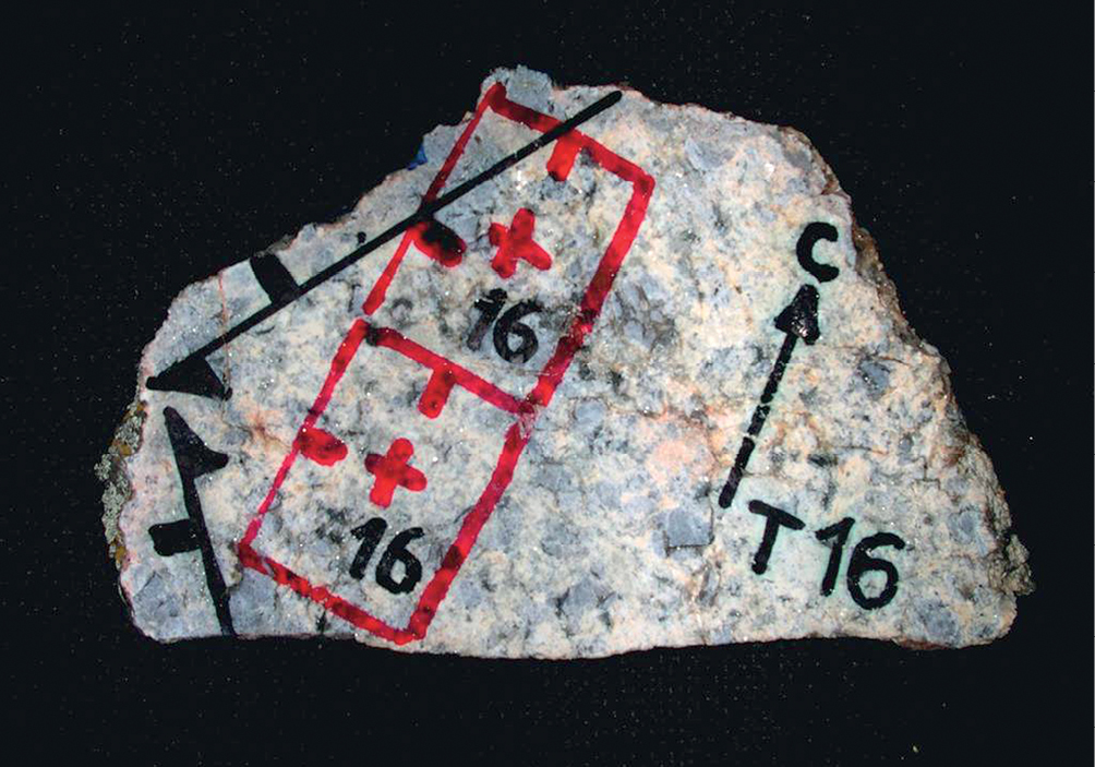 Фиг. 6. Пример ориентированного в пространстве (С – север) штуфа (Т 16), на плоскости которого отмечены места для изготовления шлифов.