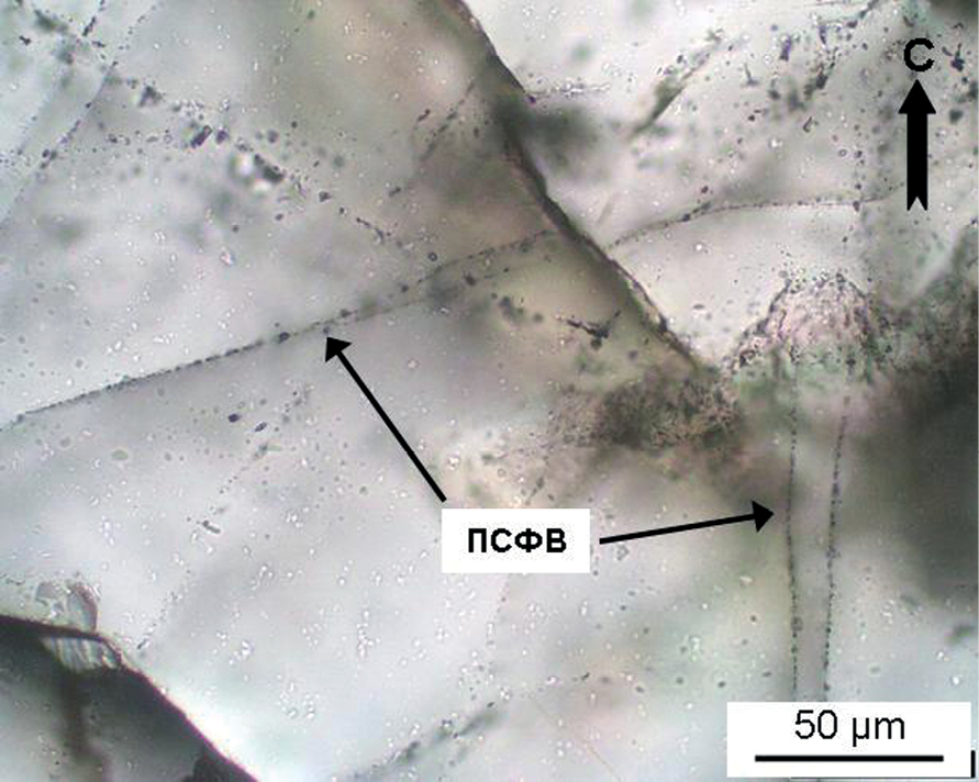 Благодаря тому, что ориентировка ПСФВ определяется вариациями параметров поля напряжений и деформаций (Lespinasse, Pecher, 1986; Cathelineau et al., 1994; Barnhoorn et al., 2010), возможно использовать их в качестве структурных маркеров для воссоздания хронологии палеопроницаемости пород, реконструкции геометрии путей миграции флюидов и установления динамики изменения термобарических и физико-химических условий на различных этапах тектогенеза геологических тел (Петров и др., 2013). Параметры ПСФВ были проанализированы с помощью компьютерных кодов AnIma (Lespinasse et al., 2005) и верифицированы средствами специальной методики микроструктурного анализа (Устинов, Петров, 2015).