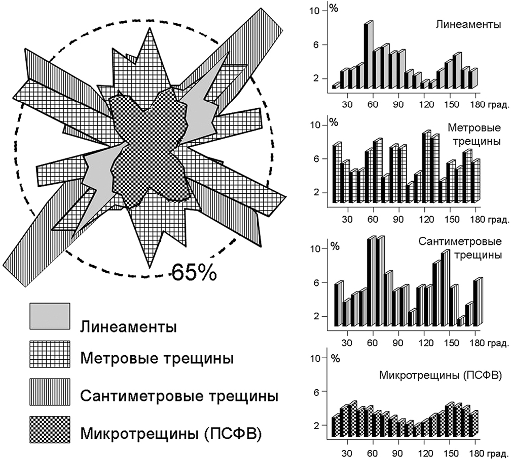 Сравнительные диаграммы на фиг. 9 (справа) интересно интерпретировать в приложении к рудным объектам. Если полученные данные дополнить, например, информацией о возрасте и характере минерального выполнения метровых трещин, то появляется возможность реконструировать связь тектонических и минералообразующих процессов, ответив на один из ключевых вопросов – в какой тектонической обстановке (на каком этапе тектогенеза) системы трещин какого направления были наиболее гидравлически активны и проницаемы для гидротермальных растворов.