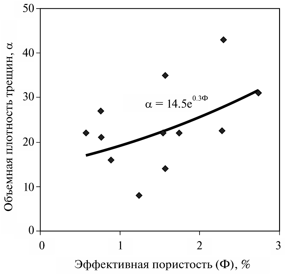 Эффективная пористость матрицы пород, установленная по цифровым изображениям шлифов (см. фиг. 7) и заверенная методом гидростатического взвешивания (Геологический факультет МГУ), изменяется от 0.41 до 2.74% при средних для всех образцов значениях 1.41%. Сравнение этих данных с результатами изучения трещиноватости на каждой площадке (базовой точке) показало, что эффективная пористость пород (Ф, %) и объемная плотность метровых трещин (a, n/м3, где n – количество трещин в естественном залегании на глубину 1 м) связаны между собой экспоненциальной зависимостью a = 14.5e0.3Ф (фиг. 10). При этом объемная плотность систем метровых трещин варьирует от 8 в породах на удалении от центральных частей (ядер) разломов сбросового и сбросо-сдвигового характера до 43 в непосредственной близости от линейной зоны пластических деформаций.