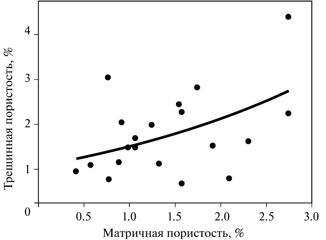 Фиг. 11. Взаимосвязь между матричной и трещинной пористостью для неоднородностей сантиметрового масштаба.