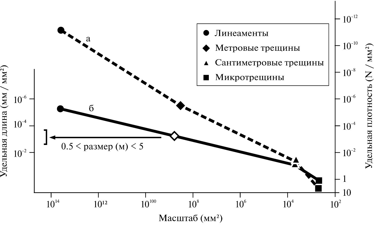 На графике наблюдается близкая к линейной зависимость удельной плотности и удельной длины неоднородностей от их масштаба. Эти данные показывают, что наличие у исследователя информации только о трещинах метрового уровня, позволяет создавать концептуальные и расчетные фильтрационно-транспортные модели, учитывающие широкий спектр разрывных нарушений, их ориентировку в пространстве и геометрические характеристики.