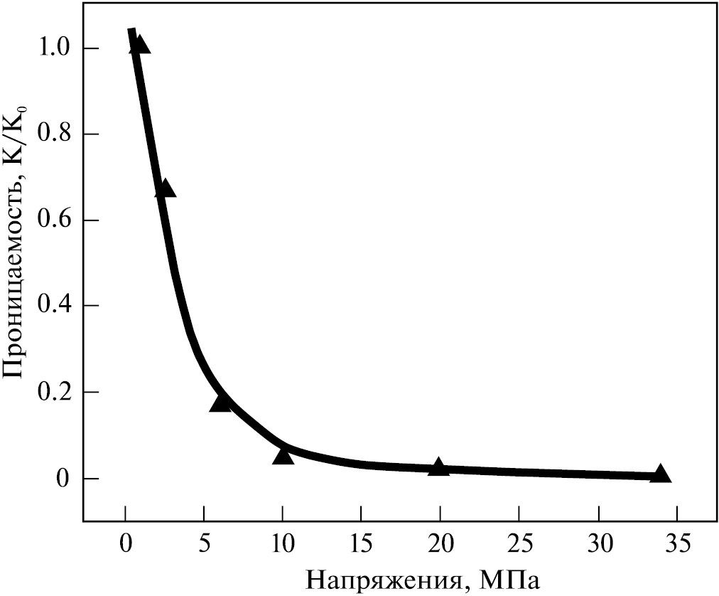 Фиг. 13. Характер изменения фильтрационной способности (К и К0 – эффективный (конечный) и исходный коэффициенты проницаемости, соответственно) трещиноватых пород в естественном залегании как функции внешнего напряжения (по Liu et al., 2000).