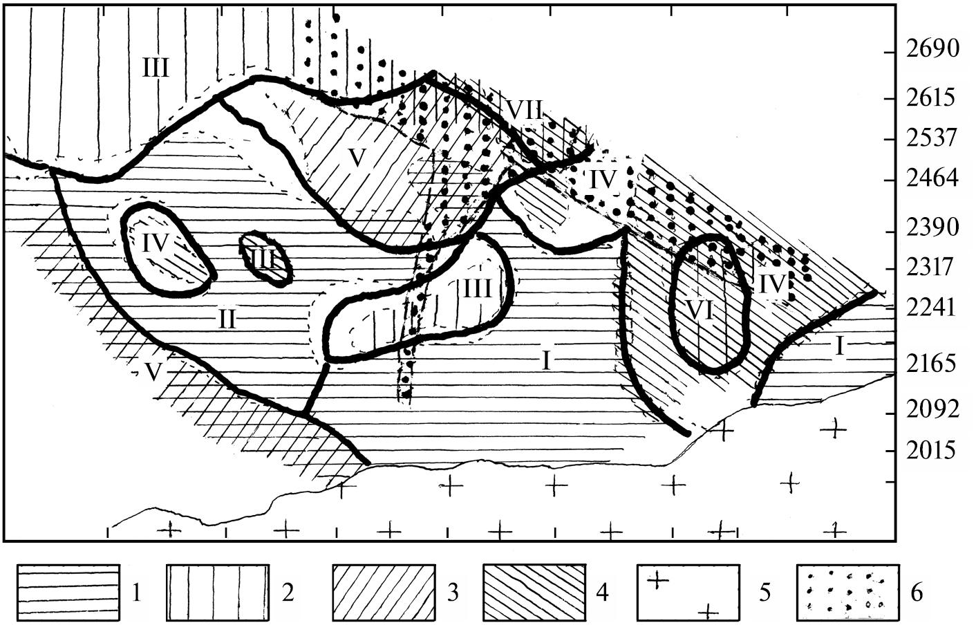 Фиг. 10. Распределение природных типов руд в Слепой залежи, представленное на проекции на вертикальную плоскость. 1–4 – максимумы % доли исходных пород в руде: 1 – скарнов; 2 – околоскарновых пород; 3 – мраморов; 4 – роговиков (в соответствии с фиг. 5–8). 5 – граниты Эльджуртинского массива. 6 – зона интенсивного гипергенного изменения. I–VII – природные типы руд. Пояснения в тексте и табл. 3.