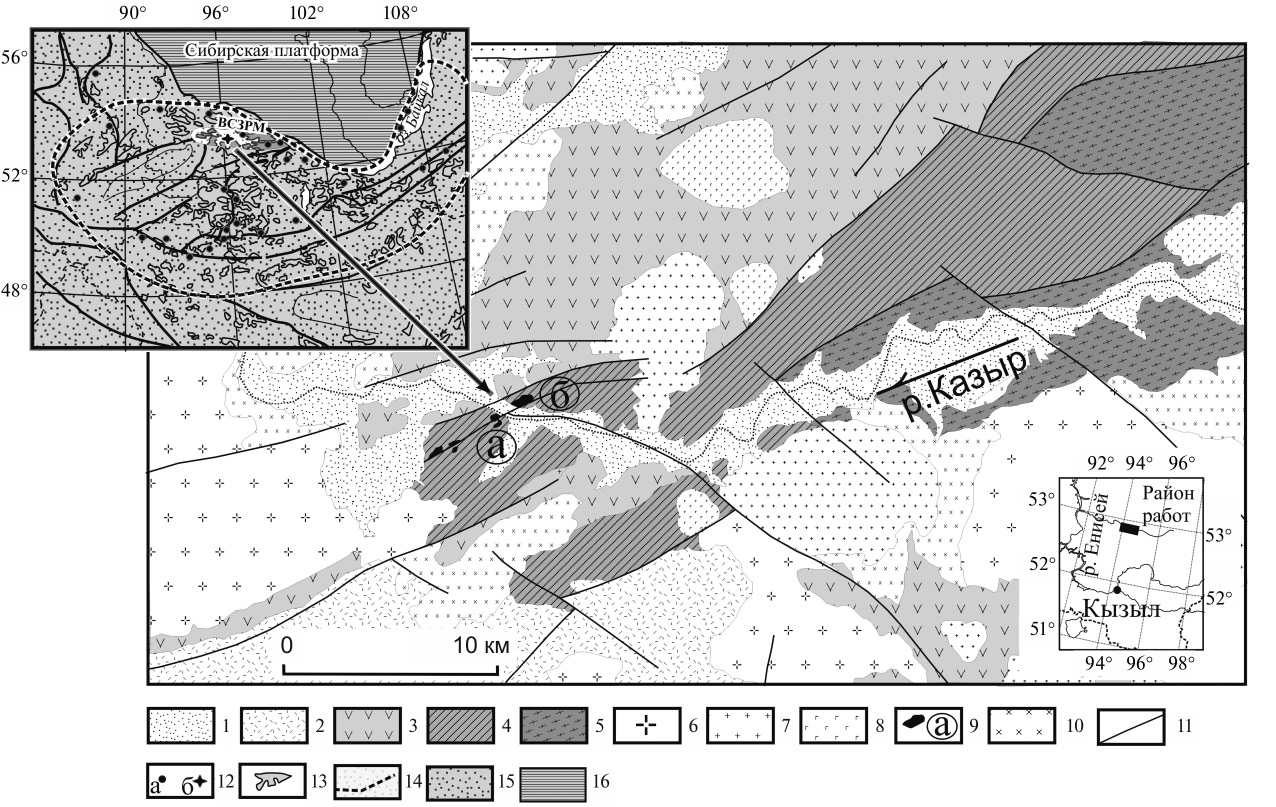 Фиг. 1. Схема геологического строения района Окуневского месторождения (по Геологической карте…, 1971). 1 – четвертичные отложения; 2, 3 – нижнепалеозойские отложения: 2 – имирская и тонская свиты, плагиоклазовые и пироксеновые порфириты, базальты, фельзиты, трахиты, туфы, 3 – копинская, осиновая, кизирская свиты, диабазовые и андезитовые порфириты, сланцы, аргиллиты, алевролиты, песчаники, известняки, туфы; 4, 5 – верхнепротерозойские отложения: 4 – овсянковская свита, известняки, мраморы, доломиты, сланцы, 5 – базыбайская свита, гнейсы, кристаллические сланцы, амфиболиты, мигматиты, мраморы; 6–10 – нижнепалеозойские интрузивные образования: 6 – буеджульский и лутагский комплексы, щелочные и субщелочные граниты, биотитовые, роговообманковые граниты, граносиениты и сиениты, 7 – беллыкский комплекс, аляскиты, биотитовые граниты, гранодиориты, диориты, 8 – казырский комплекс, габбро, анортозиты, пироксениты, горнблендиты, роговообманковые перидотиты, 9 – окуневский комплекс, рибекитовые щелочные граниты, 10 – ольховский комплекс, граниты, плагиограниты, гранодиориты, диориты, габбро; 11 – разрывные нарушения; 12–16 – условные обозначения к врезке: 12 – а) проявления магматизма А-типа, б) Окуневский редкометальный рудно-магматический комплекс, 13 – гранитоиды раннего палеозоя, 14 – границы раннепалеозойской магматической провинции, 15 – Центрально-Азиатский складчатый пояс, 16 – Сибирская платформа. На врезке: темно-серым полем выделена раннепалеозойская Восточно-Саянская редкометальная магматическая зона (ВСРМЗ).