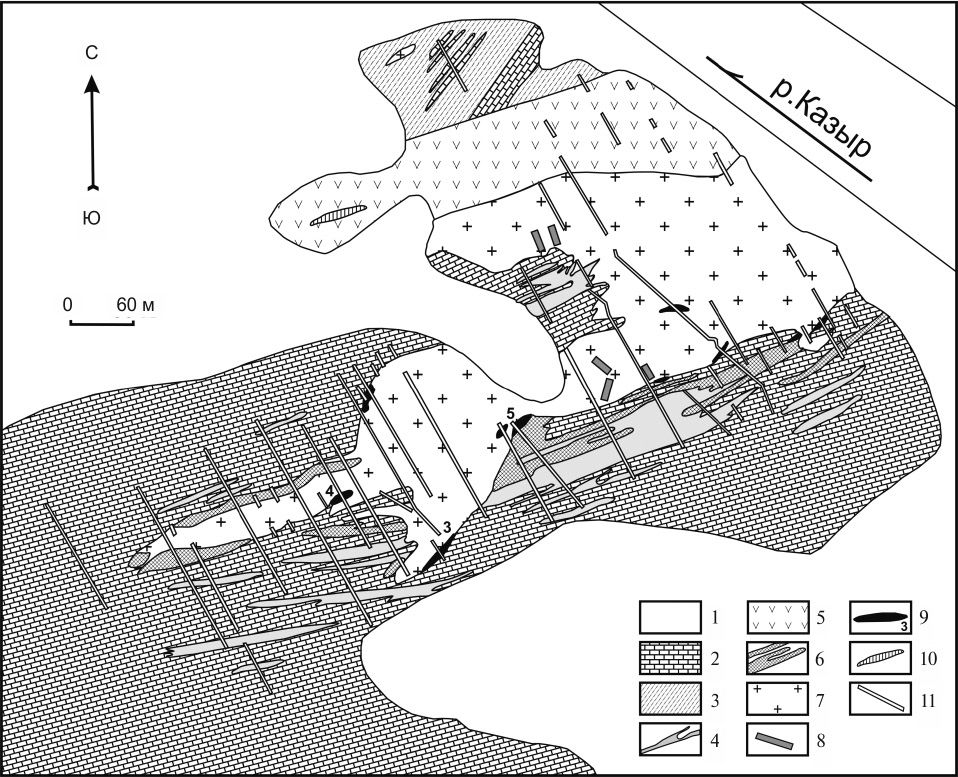 Фиг. 2. Схема геологического строения Окуневского месторождения (участок Левобережный) по данным Куприяновой, Шпанова, 2011. 1 – четвертичные отложения; 2–5 – раннекембрийская колпинская (балахтисонская) свита: 2 – известняки, 3 – кремнистые алевролиты, 4 – кварциты, 5 – диабазовые порфиры и их туфы; 6 – волластонитовые скарны; 7–8 – раннепалеозойский окуневский (сейбинский) комплекс: 7 – щелочные граниты, 8 – дайки базитов; 9 – флюорит-лейкофановые жилы, залежи, цифрами показаны их номера; 10 – полиметаллические жилы; 11 – канавы.