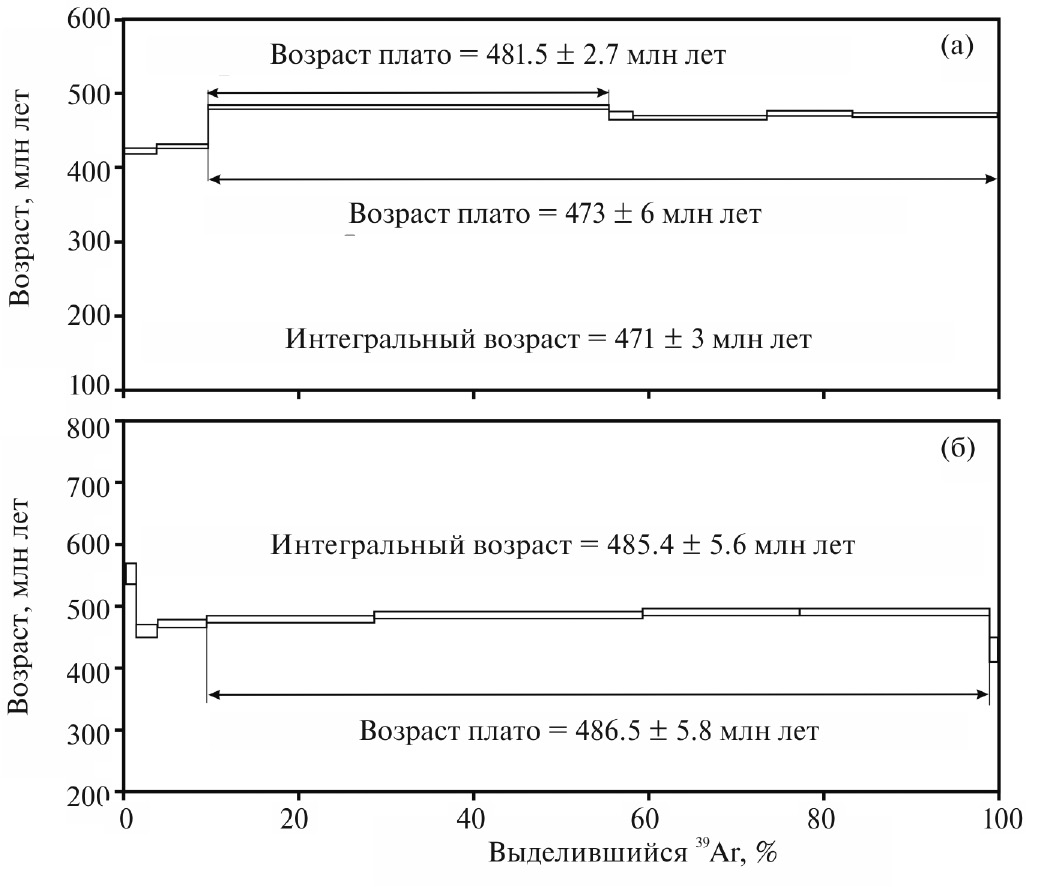 Для Ar-Ar геохронологического исследования был выделен рибекит из щелочных гранитов Левобережного участка. В спектре амфибола около 90% выделенного 39Ar образуют пятиступенчатое плато, соответствующее возрасту 473 + 6 млн лет (фиг. 3) При этом самая большая ступенька (850 °С) имеет возраст 481.5 + 2.7 млн лет, тогда как более высокотемпературные ступени примерно соответствуют 470 млн лет. Такое распределение значений характерно для амфибола с нарушенной 40Ar/39Ar изотопной системой, поэтому для уточнения возраста были выполнены 40Ar/39Ar исследования амфибола из щелочных гранитов Правобережного участка (табл. 1). Получен спектр, средне-высокотемпературные ступени которого соответствуют возрасту 486.5 + 5.8 млн лет (фиг. 3). Полученные оценки – 481.5 + 2.7 млн лет для гранитов Левобережного участка и 486.5 + 5.8 млн лет для гранитов Флюоритового участка – совпадают в пределах погрешности. Это позволяет заключить, что становление щелочных рибекитовых гранитов Окуневского массива произошло в интервале 481–486 млн лет.