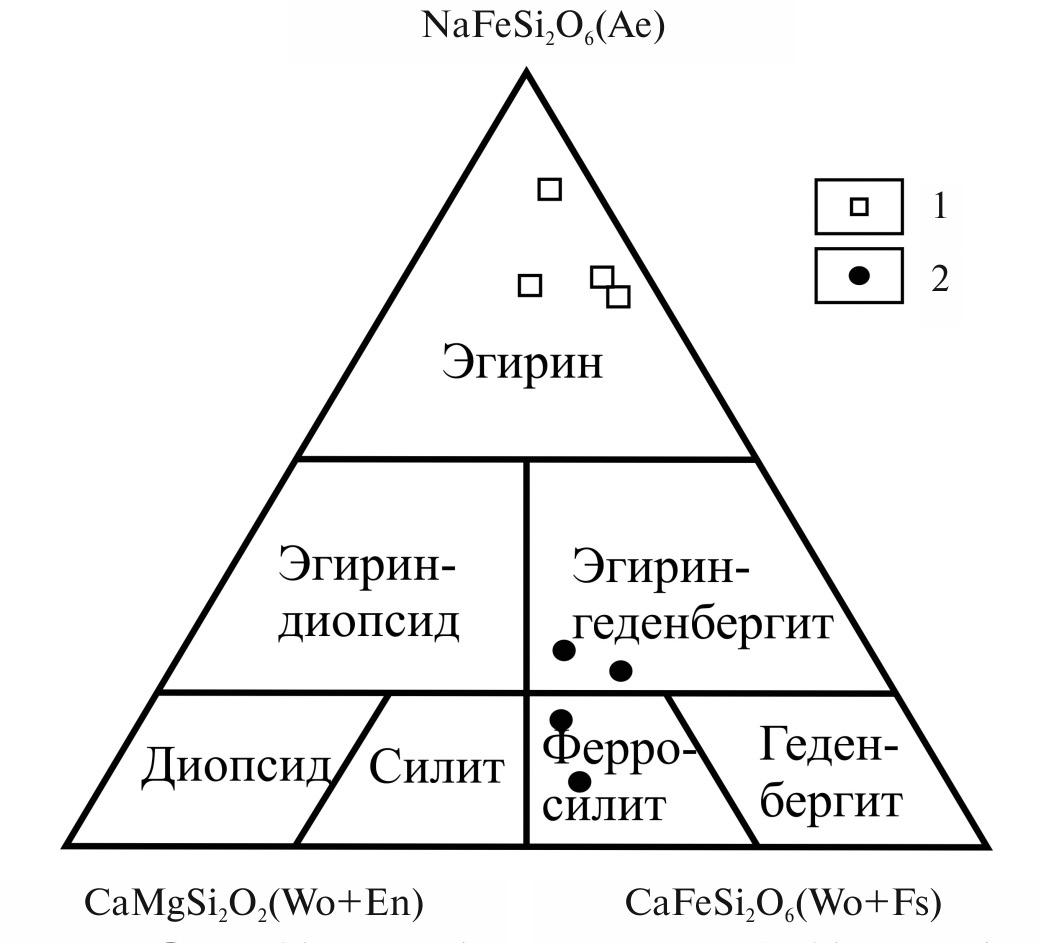 Пироксен-флюоритовые руды на месторождении встречаются реже, они образуют маломощные прожилки и жилы среди доминирующих лейкофан-флюоритовых руд. Это массивные, средне-крупнозернистые фиолетово-зеленоватые породы, состоящие из (в об.%): флюорита (40–45), пироксена (35–40), калинатрового полевого шпата (5–10), лейкофана (5–15), амфибола (2–3) (фиг. 7а, б). Флюорит часто образует зональные зерна, размер которых колеблется от 0.02 до 0.1 мм. Пироксен образует ксеноморфные выделения и встречается в основном в срастаниях, размер его 0.01–0.5 мм. По составу (Минералы, 1981) он относится к эгирин-геденбергиту и ферросилиту (фиг. 5, табл. 4). В нем содержится 49–69% геденбергитового, 35–53% диопсидового и 11–33% эгиринового миналов, содержание волластонитового компонента 28–39%, жадеитового – 0–9%. КПШ имеет незначительное распространение, размер его зерен не превышает 0.5 мм, микроклиновой решетки не наблюдалось. Амфибол образует небольшие зерна 0.05–0.2 мм и их скопления, встречается в основном в пироксене (фиг. 7д, е). По составу (Leake et al., 1997, 2004) он отвечает рихтериту (табл. 3, № 3) и отличается от амфибола лейкофан-флюоритовых руд (в мас.%) более высокими содержаниями CaO (6.24–7.69) и MgO (до 12), и более низкими Na2O (4.58–5.46) и Feобщ (18). Лейкофан встречается неравномерно, образуя полисинтетические двойники прорастания зернистого или радиально-лучистого облика между зернами флюорита и пироксена (фиг. 7б), размер его зерен от 0.01–0.5 до 5 мм, в нем содержатся включения мелких зерен флюорита. По данным (Генетические…, 1975; Куприянова, Шпанов, 2011), помимо лейкофана в небольшом количестве встречается гадолинит. Акцессорные и второстепенные минералы ассоциируют в основном с пироксеном и представлены цирконом, сфеном (титанитом), апатитом, бритолитом (табл. 2), бастнезитом, эшенитом-(Y) – приоритом (фиг. 7в–е), ортитом, хлоритом, эпидотом и кальцитом.