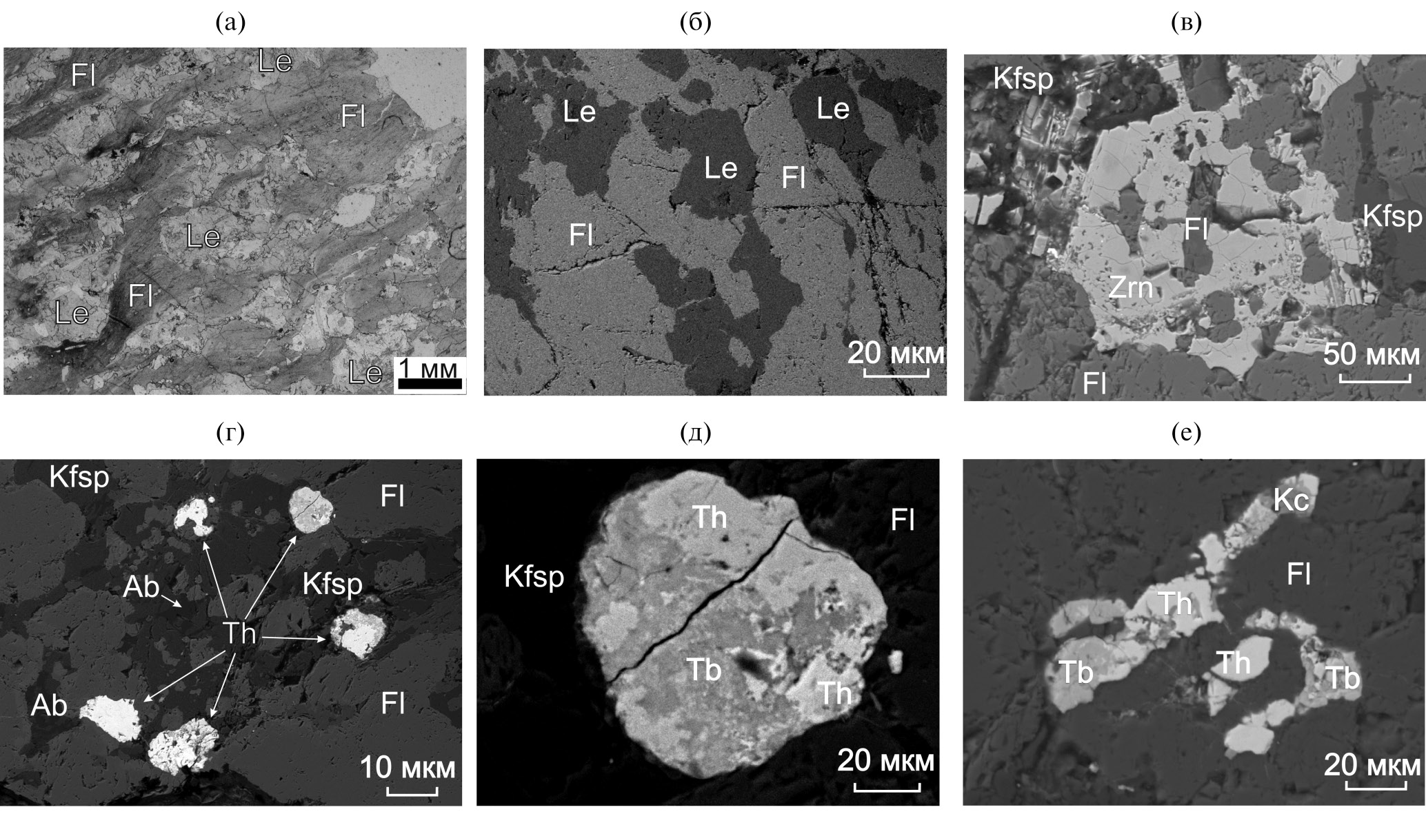 Щелочные граниты представлены светло-серыми средне-крупнозернистыми массивными породами. Для них характерна гипидиоморфнозернистая и порфировидная (фиг. 4а, б), реже катакластическая и микрографическая структуры. Породы состоят из калиевого полевого шпата (60–65%), кварца (25–35%), щелочного амфибола (7–10%), иногда встречается моноклинный пироксен (1–2%). Акцессорные и вторичные минералы представлены цирконом, сфеном (титанитом), флюоритом, магнетитом, бастнезитом, ильменитом, эпидотом, кальцитом (табл. 2). По данным И.И. Куприяновой (2011), в гранитах также присутствуют: пирохлор, торит, малакон, галенит, пирит, бетафит и молибденит. Калиевый полевой шпат представлен микроклин-пертитом таблитчатой или неправильной формы размером 0.2–1 до 2 мм. По химическому составу КПШ является чисто калиевой разновидностью и представлен микроклином, диагностированным по микроклиновой решетке, который замещает более ранний КПШ. Кварц часто образует мелкие, подробленные зерна – 0.05–0.2 мм, а также зерна размером до 4 мм неправильной формы, с характерным волнистым погасанием, что является следствием катаклаза. Плагиоклаз представлен альбитом, который образует пертиты таблитчатой и пятнистой формы в КПШ, а также таблитчатые полисинтетические кристаллы – 0.2–0.5 мм по периферии последних (фиг. 4б). Щелочной амфибол образует ксеноморфные выделения, размер которых составляет 0.1–2 мм, реже отмечается в виде идиоморфных зерен (фиг. 4а). По полученным микрозондовым данным диагностируются разновидности амфибола, отвечающие железистым разностям и характеризующиеся низким содержанием Al (AlVI < Fe3+). Согласно классификационным характеристикам (Leake et al., 1997, 2004), одна разновидность отвечает натриево-кальциевому ряду – феррорихтериту, другая натриевому – арфведсониту (табл. 3, № 1). В составе феррорихтерита присутствует до 6.12 масс.% CaO, и по сравнению с арфведсонитом в нем более низкие содержания SiO2, TiO2 и K2O. В феррорихтерите встречаются мелкие (до 10 мкм) зерна ильменита и флюорита (фиг. 4в), распределенные в виде цепочек. К выделениям амфибола тяготеют зерна циркона с размером до 1 мм. В цирконе диагностируются ксенотим и флюорит (фиг. 4г).