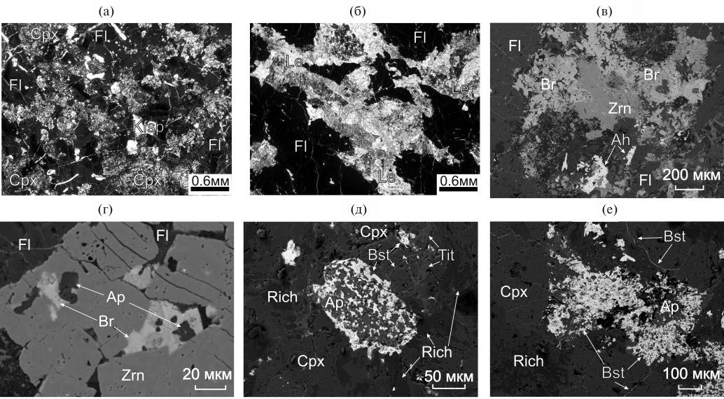 Циркон образует достаточно крупные идиоморфные кристаллы до 0.3 мм (фиг. 7в) и обычно ассоциирует с бастнезитом, бритолитом и эшенитом. Зерна бритолита и баснезита аморфные, со множеством прорастаний и замещений с цирконом. В цирконе диагностируются апатит, эшенит-(Y), бритолит – то есть те же минералы, что и на макроуровне (фиг. 7г). Бастнезит встречается и в виде достаточно крупных мономинеральных кристаллов. Встречаются полностью распавшиеся кристаллы бритолита, по которым развивается бастнезит, причем последний обнаружен также в мелких трещинах (фиг. 7д, е). Там же встречается сфен (титанит), часто развивающийся по прожилкам (фиг. 7д).