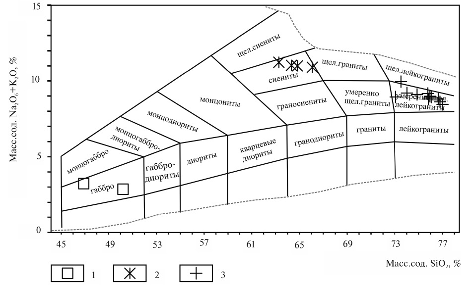 В координатах дискриминационных петрохимических диаграмм (Whalen et al., 1987; Pearce et al., 1984) граниты и сиениты попадают в поля составов гранитов А-типа или находятся в поле составов внутриплитных гранитов (WRG). По классификации Л. В. Тауссона (1977) они относятся к редкометальным гранитоидам щелочного ряда.