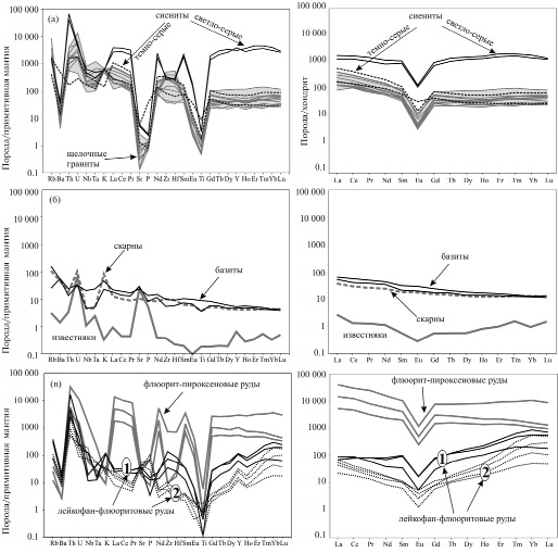 Фиг. 9. Графики распределения элементов-примесей в породах Окуневского месторождения, нормированных к примитивной мантии по (Sun, McDonough, 1989). а – щелочные граниты, сиениты; б – базиты, мраморизованный известняк и гранат-волластонитовый скарн; в – лейкофан-флюоритовые и пироксен-флюоритовые руды. 1, 2 – группа руд.