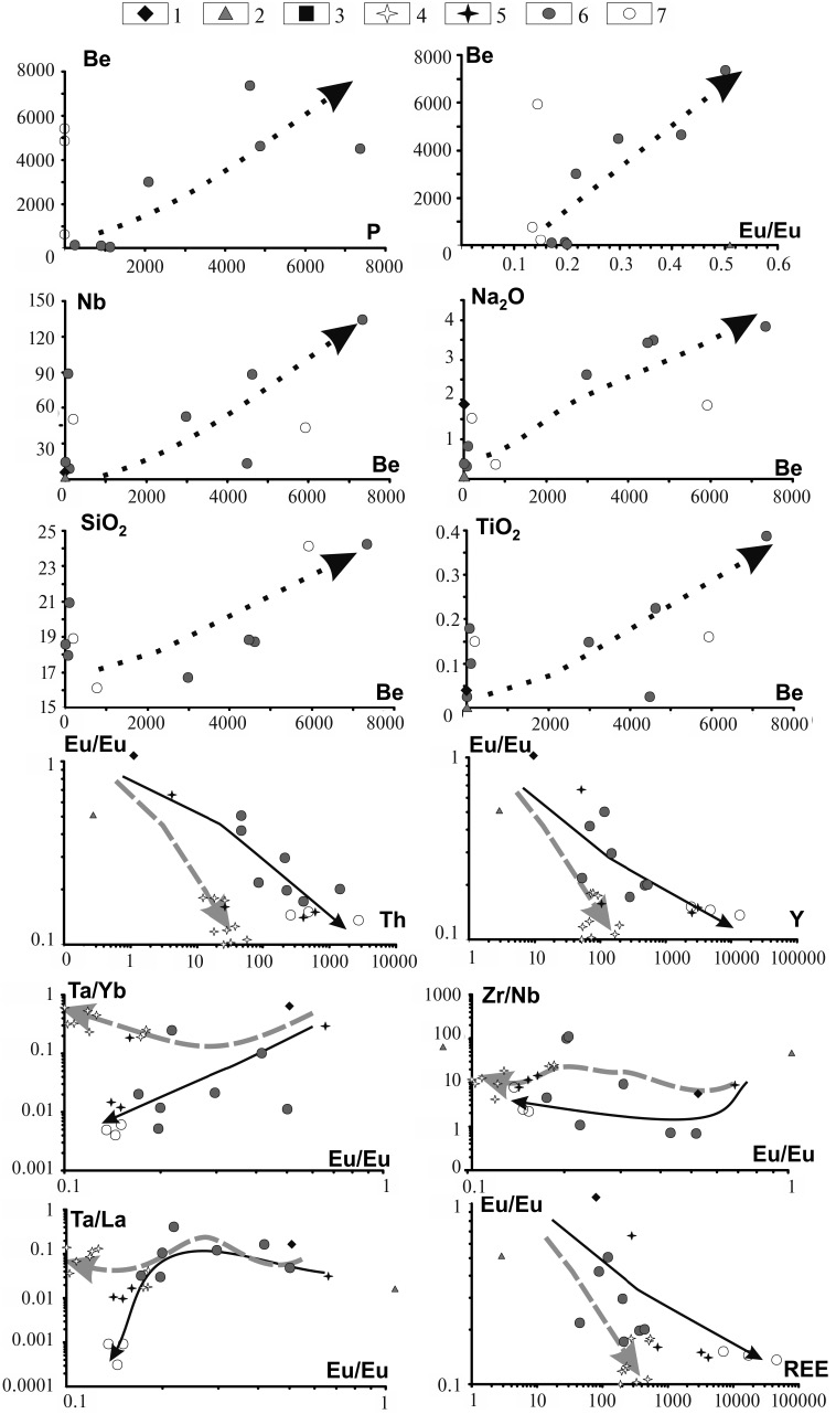 Фиг. 10. Поведение Be относительно петрогенных элементов и поведение Eu/Eu* относительно несовместимых элементов в породах Окуневского месторождения. 1 – мраморизованный известняк; 2 – скарн; 3 – дайка базита; 4 – щелочные граниты; 5 –сиениты; 6 – лейкофан-флюоритовые руды; 7 – пироксен-флюоритовые руды. Точечная стрелка – тренд в поведении бериллиевых руд; черная тонкая стрелка – тренд сиенитов и пироксен-флюоритовых руд; пунктирная серая стрелка – тренд щелочных гранитов.