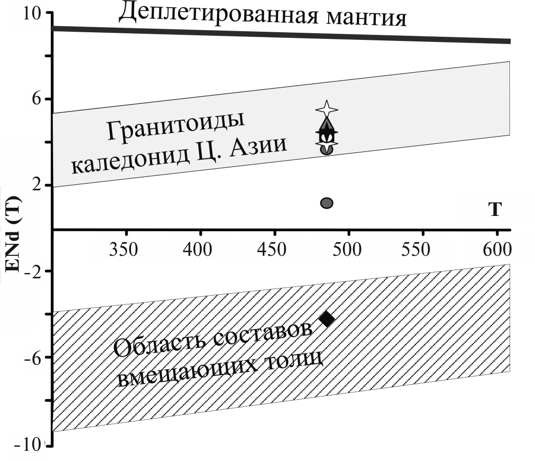 Изотопный состав Nd определен во всех породах, участвующих в строении Окуневского месторождения – в щелочно-салических породах окуневского комплекса, дайке базитов, различных по составу бериллиевых рудах, скарнах и вмещающих известняках. Так, величина εNd (t), рассчитанная на возраст 485 млн лет, составила в базитах даек +4.3, в щелочных гранитах и щелочных сиенитах от +4 до +4.4, а в альбитизированных щелочных гранитах +5.5 (фиг. 11). В рудах величина εNd (t) меняется от +1.2 до +4.2, в скарнах составляет +4.8, а во вмещающих известняках овсянковской свиты –4.2. Составы базальтов даек и щелочно-салических пород окуневского комплекса на месторождении имеют близкие значения, что указывает на сходство состава изотопных источников их расплавов. Близки они и к изотопному составу вмещающей для них ювенильной коры каледонид Центральной Азии (Коваленко и др., 1996, Ярмолюк и др., 2002, Ковач и др., 2011, Руднев, 2013). Гранат-волластонитовые скарны характеризуются близкими значениями с магматическими породами. Известняки овсянковской свиты попадают в поле супракрустальных толщ региона (Козаков и др., 2003). Две из трех проб с бериллиевым оруденением попадают в область составов магматических пород месторождения, а третья занимает промежуточную позицию между последними и составами вмещающих известняков.