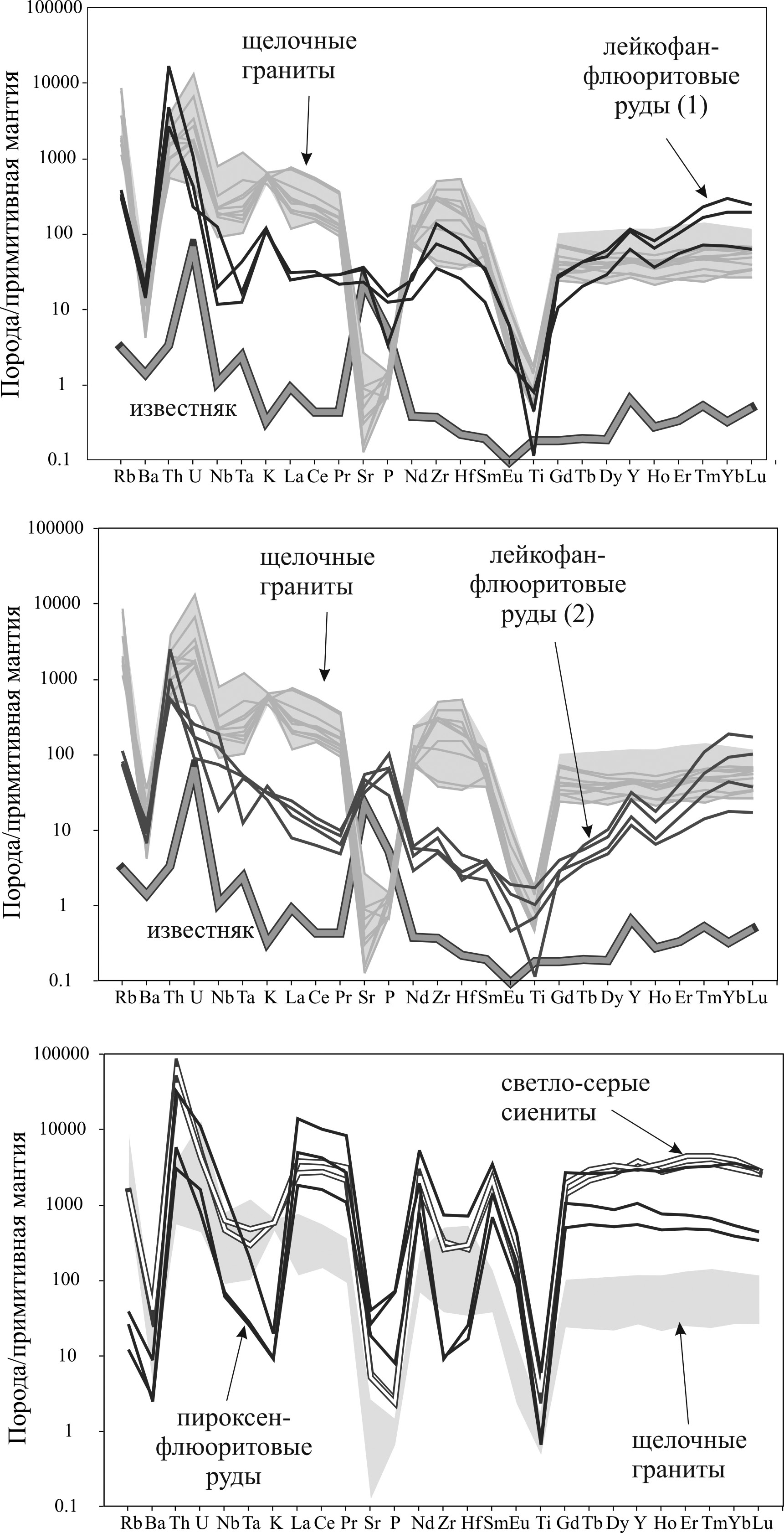 Следует отметить, что имеются определенные связи между геохимическими характеристиками магматических пород и руд, что хорошо видно на серии графиков (фиг. 12). Так, особенности распределения редких элементов в лейкофан-флюоритовых рудах первой геохимической группы, выделенной выше, в целом соответствуют их распределению в щелочных гранитах. При этом они имеют систематически более низкие содержания большинства элементов, чем в гранитах. Исключение составляют Sr, P и Y, а также тяжелые редкие земли, демонстрирующие более высокие содержания. На графике приведен также состав вмещающих Окуневский массив известняков. Можно отметить, что все указанные исключения хорошо согласуются с соответствующими аномалиями в составе последних. Это позволяет предполагать, что состав лейкофан-флюоритовых руд первой геохимической группы был сформирован при ведущей роли магматических пород, но при определенном влиянии вмещающих известняков.