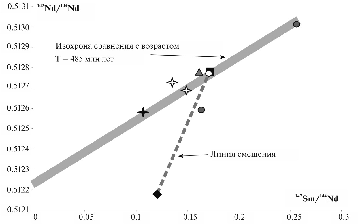 Отметим еще одну особенность изотопных составов гранитоидов и руд, которую можно рассматривать как подтверждение одновременности формирования магматических пород и рудной минерализации. На графике 147Sm/144Nd–143Nd/144Nd (фиг. 13) их изотопные составы преимущественно рассредоточились вдоль линейного тренда, соответствующего привлеченной для сравнения изохроне 485 млн лет. Приуроченность изотопного состава скарнов к этому тренду, очевидно, свидетельствует о формировании скарнов при активном воздействии магматических пород на карбонаты, что вполне согласуется с их геохимическими характеристиками (фиг. 9). Отклонение одной из рудных проб от выделенного тренда, по-видимому, было связано с их контаминацией вмещающими карбонатами.