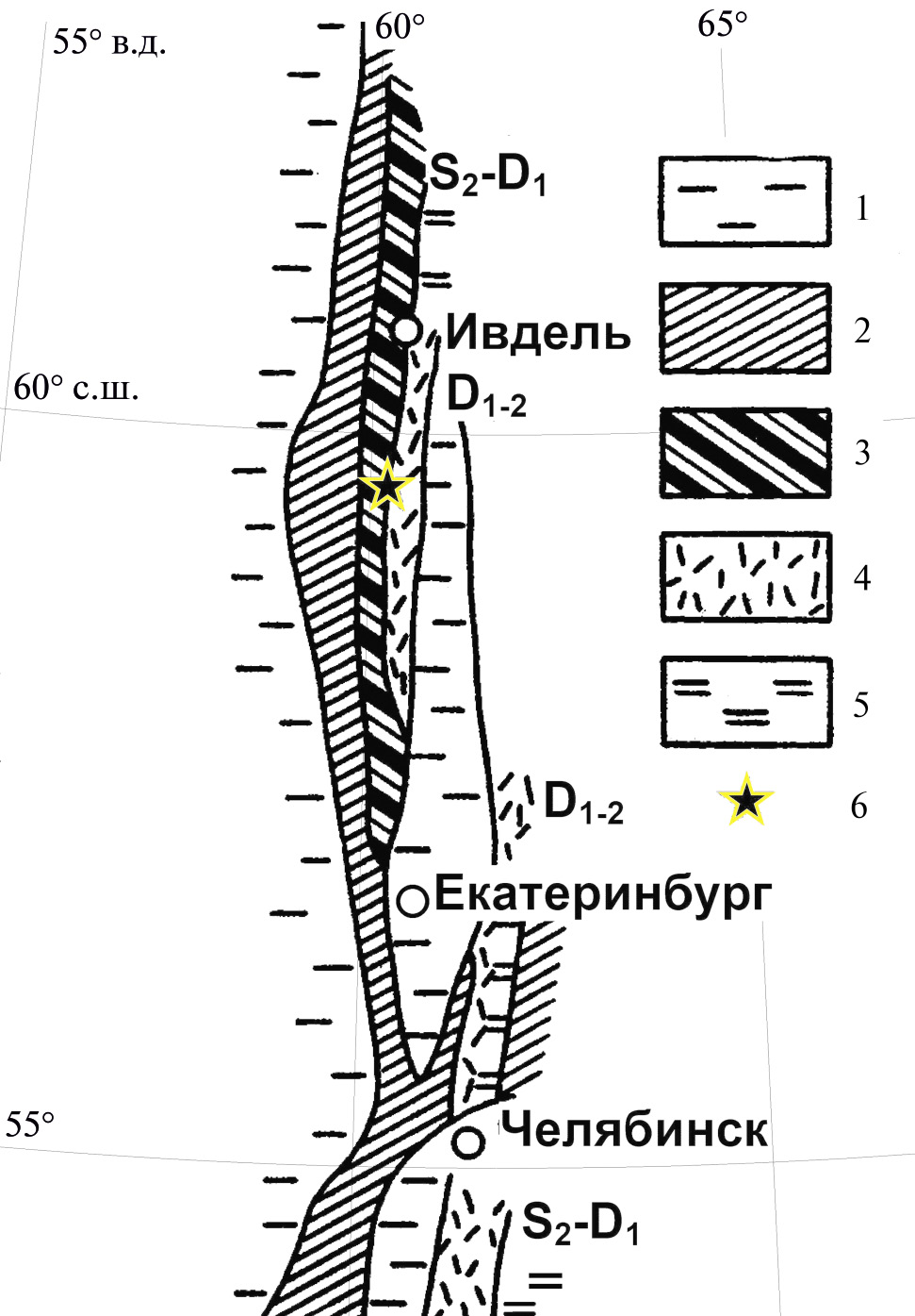 Фиг. 1. Позиция Воронцовского месторождения на тектонической схеме средней части Урала, упрощенно по (Язева и др., 1989). 1 – комплексы пассивной окраины и микроконтинентов; 2 – тектонические скученные комплексы океанической коры и энсиматических островных дуг; 3 – базальтоидные (железоносные) вулканоплутонические ассоциации краевых поясов; 4 – андезитоидные (меденосные) вулканоплутонические ассоциации краевых поясов; 5 – трахиандезит-монцодиоритовые ассоциации; 6 – Воронцовское месторождение.