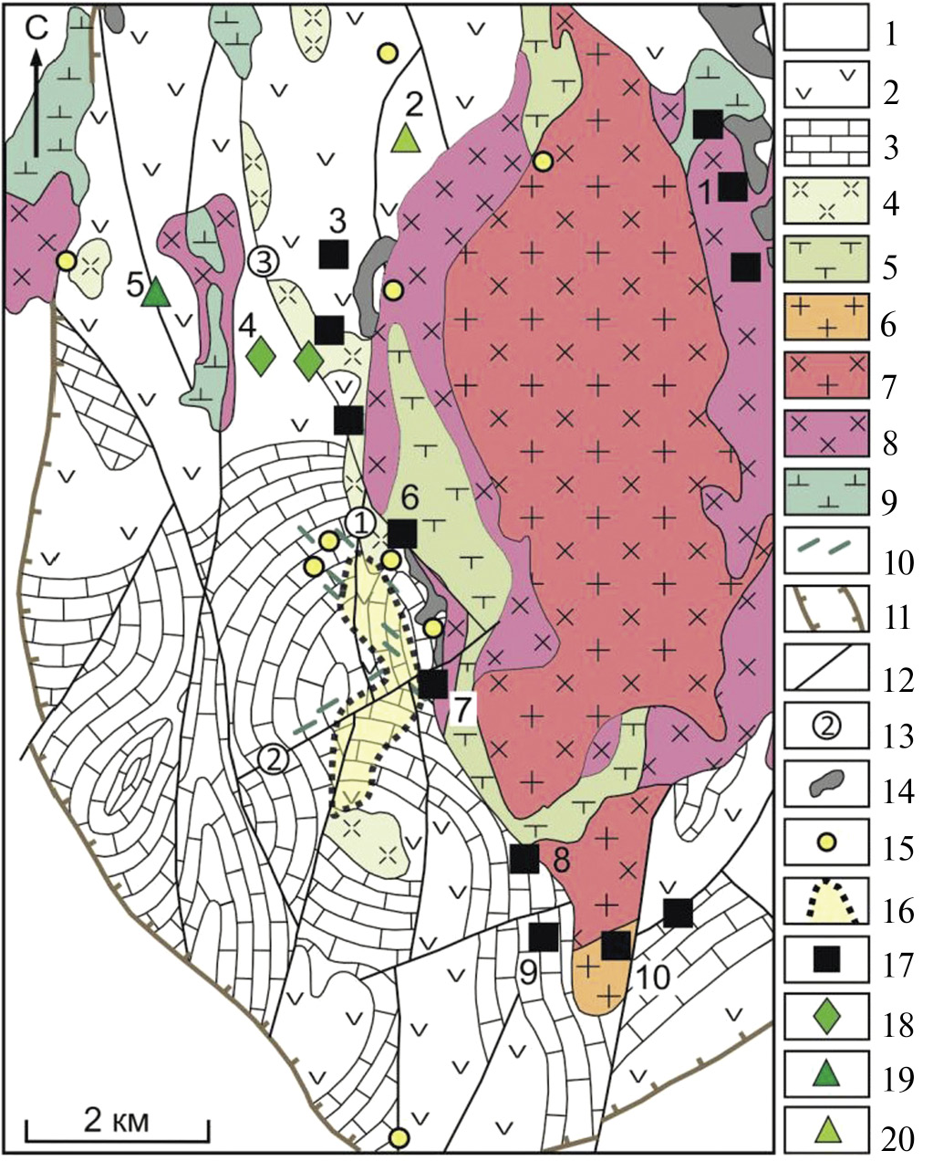 Фиг. 2. Схематическая геологическая карта южной части Турьинско-Ауэрбаховского рудного района. Использованы фондовые материалы Н.С. Лисова (1978) и В.Н. Боброва (1991). 1 – вулканогенные образования трахибазальт-трахиандезитовой формации, в подчиненном количестве – туфогенно-осадочные разности и известняки, турьинская свита (S2–D1tr); 2–3 – осадочные, туфогенно-осадочные и вулканогенные образования базальт-андезит-дацитовой формации, краснотурьинская свита (D1kr): 2 – андезиты, их туфы, туфопесчаники, туфоалевролиты; 3 – известняки; 4–5 – раннедевонские субвулканические образования: 4 – диоритовые порфириты; 5 – андезибазальтовые и долеритовые порфириты; 6–9 – интрузивные образования габбро-диорит-гранитовой формации, ауэрбаховский комплекс (D1a): 6 – граниты, аляскитовые граниты; 7 – гранодиориты; 8 – диориты, кварцевые диориты; 9 – габбро, габбродиориты; 10 – дайки диоритовых порфиритов, лампрофиров, долеритов и габбродолеритов (вне масштаба); 11 – разломы, ограничивающие вулкано-тектоническую депрессию; 12 – остальные тектонические нарушения; 13 – рудоконтролирующие разломы района Воронцовского месторождения: 1 – Воронцовский, 2 – Южноворонцовский, 3 – Североворонцовский; 14 – участки скарнирования; 15 – рудопроявления золото-сульфидно-кварцевой формации; 16 – контур золоторудного Воронцовского месторождения; 17 – магнетит-скарновые месторождения; 18 – то же, с наложенной пирротиновой и пирит-халькопиритовой минерализацией; 19 – медно-скарновые месторождения с пирит-халькопиритовыми рудами; 20 – то же, с эпидозитами. Скарновые месторождения и проявления (Подлесский, 1979): 1 – Ауэрбаховское, 2 – Ново-Песчанское, 3 – Северо- и Южно-Песчанские, 4 – Западно-Песчанское, 5 – Полуденское, 6 – Северо-Воронцовское и Воронцовское, 7 – Южно-Воронцовское, 8 – Гаревское, 9 – Владыкинское, 10 – Каквинское.