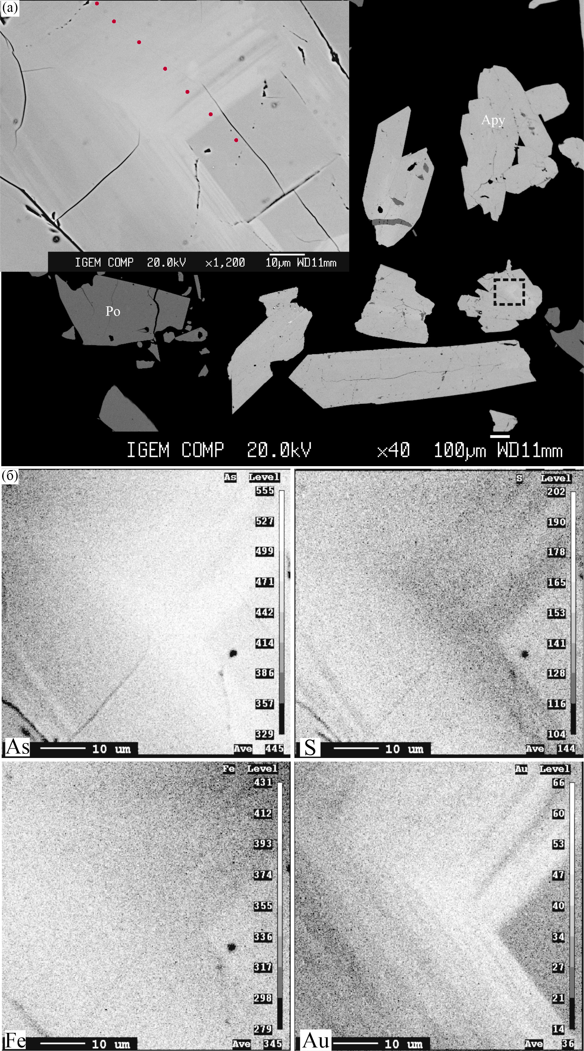Фиг. 7. Результаты анализа зерен синтетического арсенопирита (обр. № 1417-1418). а – изображение в режиме обратно-отраженных электронов (BSE), кристаллы арсенопирита (Apy) и пирротина (Po), увеличенное изображение участка зонального кристалла арсенопирита (область снимка показана пунктиром), для которого построены карты распределения элементов; б – карты распределения Fe, Au, As и S. Условия съемки карт: Fe (Kα, LIF), As (Lα, TAP), S (Lα, TAP), Au (Lα, LIFH); ток 20 нА, время в точке 90 мс. Видна прямая корреляция между содержаниями Au и As и обратная Au–Fe, Au–S.