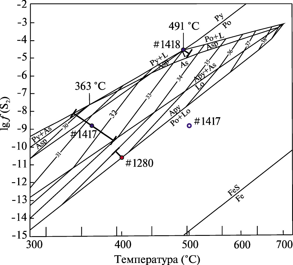Состав арсенопирита обр. № 1280 на диаграмме lg f S2 – T (°C) (Krestchmar, Scott, 1976) (фиг. 8) попадает на линию равновесия арсенопирит-пирротин-леллингит (Apy + Po + Lö). Это положение на диаграмме находится в хорошем согласии с составом арсенопирита и фазовым составом образца для температуры синтеза ~400 °C на холодном конце ампулы. Состав арсенопирита № 1418 при температуре на холодном конце около 500 °C попадает в поле устойчивости ассоциации арсенопирит-пирит-расплав (Apy + Py + L), что также отвечает данным работы (Krestchmar, Scott, 1976). Вместе с тем, состав арсенопирита из обр. № 1417 не согласуется с экспериментальными данными (Krestchmar, Scott, 1976). При температуре синтеза ~500 °C состав пирротина, сосуществующего с арсенопиритом в образце № 1417, в соответствии с результатами (Toulmin, Barton, 1964) дает значение lg f S2 ~ –9. Это значение lg f S2 находится вне поля устойчивости арсенопирита в поле пирротин-леллингит (Po + Lö, полый кружок на фиг. 8). Указанная летучесть серы для состава арсенопирита обр. № 1417 отвечает температуре около 360 °C, что существенно ниже температуры синтеза (залитый кружок на фиг. 8). Подобные нарушения химического состава арсенопирита наблюдались и для природных образцов (Бортников, 1993). Вероятно, в нашем случае это несоответствие связано с неравновесностью системы, обусловленной сложной методикой синтеза – “ампула в ампуле”. Кроме того, диапазон концентрации Fe в синтезированных нами и природных кристаллах арсенопирита (Бортников, 1993) существенно шире, чем в работе (Krestchmar, Scott, 1976), что могло привести к смещению составов синтезированных кристаллов арсенопирита на диаграмме lg f S2 – T (°C) по сравнению с данными (Krestchmar, Scott, 1976).