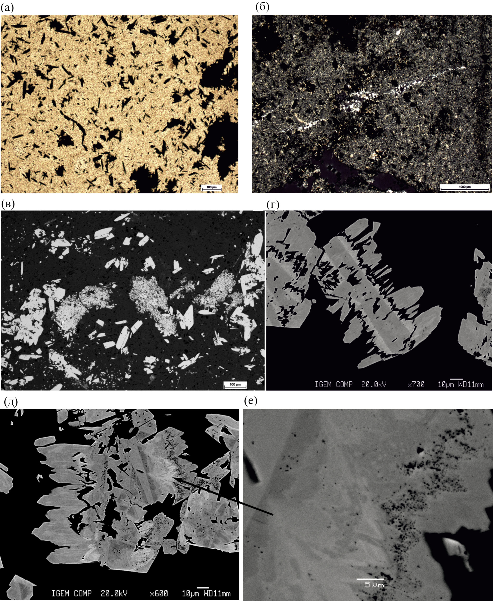 Фиг. 10. Арсенопирит мышьяк-леллингит-арсенопиритовой ассоциации (Apy-2). а, б – сульфидизированный аргиллизит с карбонатно-кварцевыми золото-содержащими просечками, фото в проходящем свете (а – N||, б – N ×); в – основная масса породы насыщена пылью игольчатого арсенопирита и леллингита и ажурными агрегатами арсенопирита с включениями самородного золота; г – сечение агрегата, в котором на прямоугольный центральный реликт сернистого арсенопирита (Apy-1) перпендикулярно нарастают зональные кристаллы позднего мышьяковистого арсенопирита (Apy-2); д, е – зональное строение веероподобных агрегатов мышьяковистого (As/S ≥ 1) арсенопирита (Apy-2) с реликтами раннего сернистого арсенопирита (Apy-1) и зоной с включениями силикатных минералов.