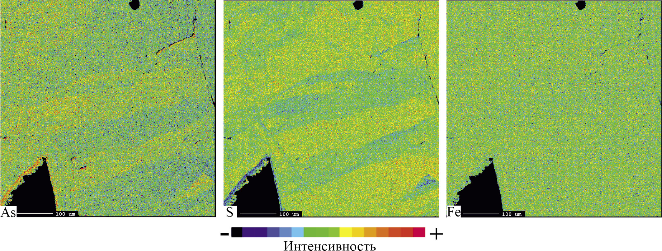 Данные, полученные для природных кристаллов, также указывают на наличие обратной корреляционной связи между содержаниями Au и S и прямой – для пары Au–As (фиг. 10в, г – Apy-1; фиг. 11б, в, г – Apy-2). Связь между содержаниями Au и Fe в пределах отдельных зон кристаллов проявляется слабее. Вероятно, это связано с более узким диапазоном содержаний Fe, что хорошо видно на карте составов основных компонентов образца Apy-1 (фиг. 12).