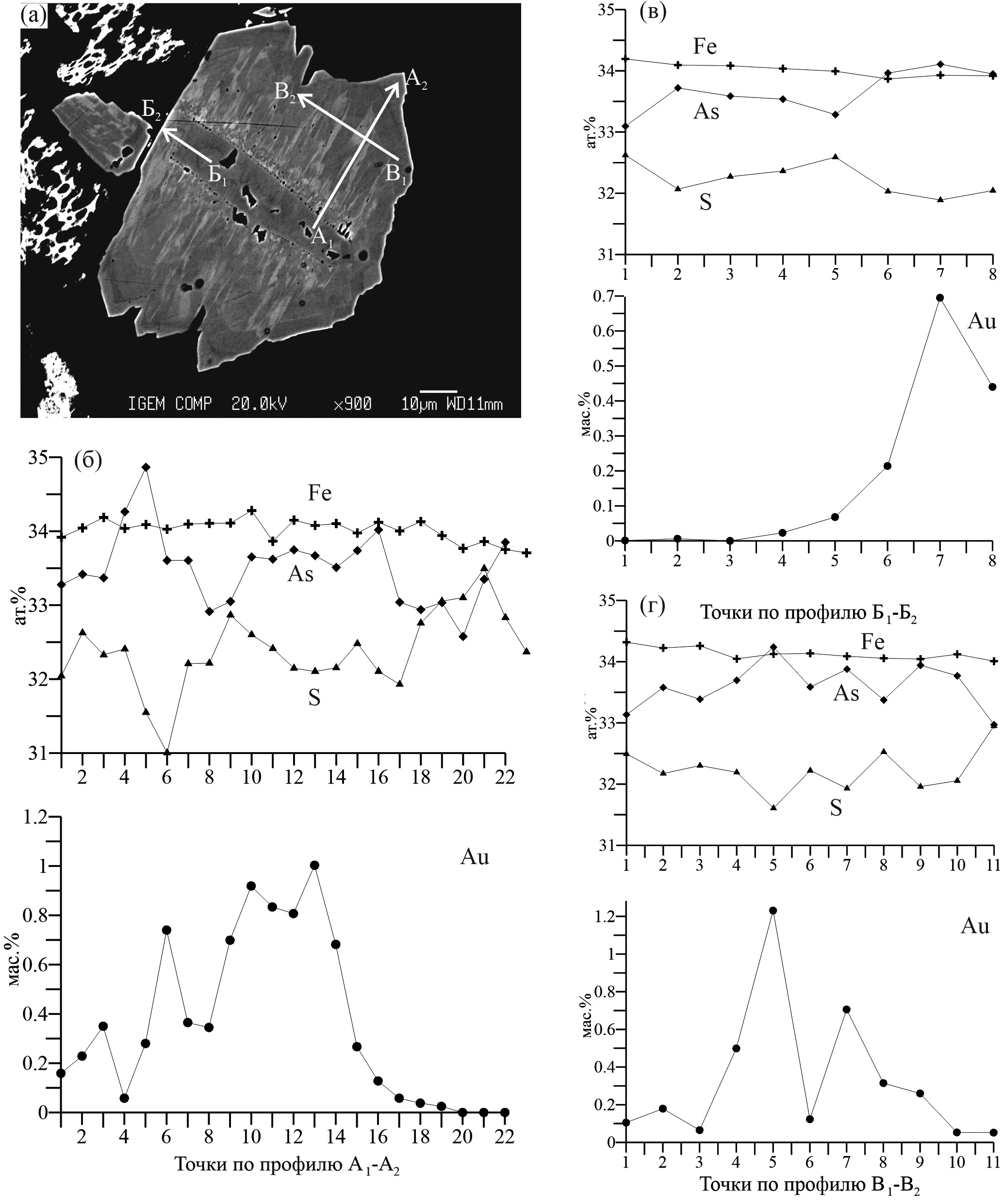 Фиг. 13. Результаты изучения РСМА зерен природного арсенопирита Apy-2 (Воронцовское месторождение). а – снимок в режиме обратно-отраженных электронов (BSE) c указанием профилей, по которым проводились измерения состава; б, в, г – данные по составу.