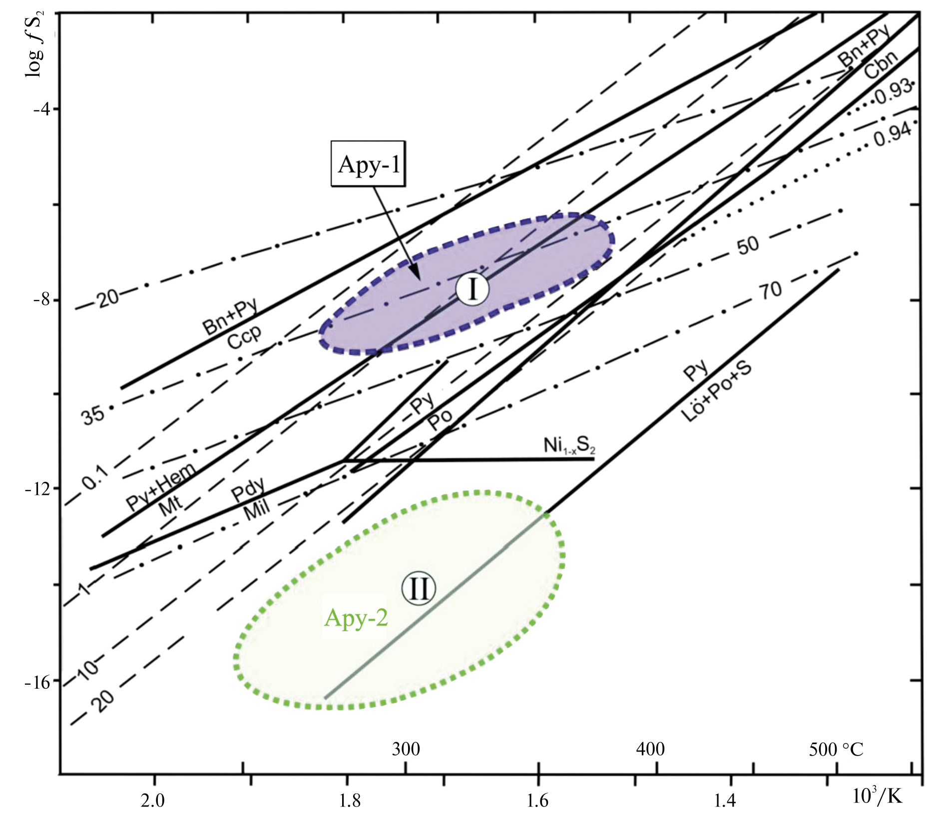 Фиг. 15. Положение полей кристаллизации сульфидных минеральных ассоциаций с арсенопиритом для Воронцовского месторождения на диаграмме “температура – активность серы”. Номера полей на диаграмме соответствуют номерам ассоциаций в табл. 1 и 4. Линиями показаны: сплошными – равновесные линии реакций сульфидизации, штриховыми – линии железистости сфалерита (мольные доли), штрих-пунктирными – линии содержаний серебра в золоте (атомные доли), пунктирными – линии железистости пирротина (атомные доли). Модифицировано по (Vikentyev et al., 2019). Условные обозначения минералов: Pу – пирит FeS2, Ccр – халькопирит CuFeS2, Pо – пирротин, Sp – сфалерит ZnS, Apy – арсенопирит FeAsS, Lō – леллингит FeAs2, Bn – борнит Cu5FeS4, Cbn – кубанит CuFe2S3, Mt – магнетит Fe3O4, Hem – гематит Fе2О3, Mil – миллерит NiS, Pdy – полидимит Ni3S4, As – самородный мышьяк.