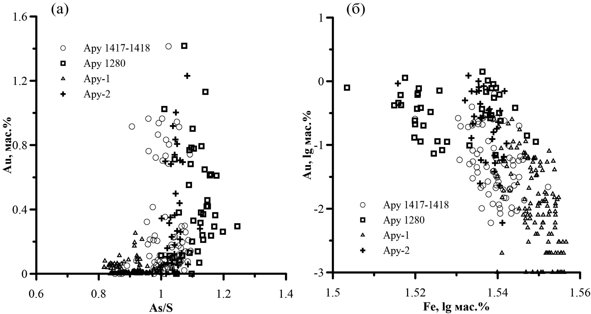 Следует отметить, что физико-химические условия (температура, летучесть серы) образования арсенопирита Apy-1 и Apy-2 существенно различаются: Apy-1 кристаллизовался при более высоких температуре и летучести серы, в то время как для более позднего по времени образования Apy-2 эти параметры существенно ниже (табл. 1, фиг. 15). Соответственно, Apy-1 обогащен серой (As/S < 1), а Apy-2 – более богат мышьяком (As/S > 1). Поскольку Apy-2 обогащен Au по сравнению с Apy-1, можно утверждать, что прямая корреляция Au–As и обратная Au–S проявляются не только на локальном уровне в пределах отдельных зон и зерен арсенопирита из обеих минеральных ассоциаций, но и, несмотря на разницу в значениях концентраций Au и условиях образования, характерны для месторождения в целом. Это наблюдение подтверждает сделанное выше предположение о разной природе корреляционных связей Au–As и Au–Fe. Обратная корреляция Au–Fe обусловлена механизмом изоморфного замещения: Au замещает Fe в структуре арсенопирита. Прямая связь Au–As, вероятно, вызвана различием в режиме летучести серы при отложении зерен арсенопирита на разных стадиях образования месторождения: более поздний и более золотоносный Apy-2 образовался при пониженном относительно раннего Apy-1 значении летучести серы. Соответственно Apy-2 обогащен мышьяком (фиг. 15).