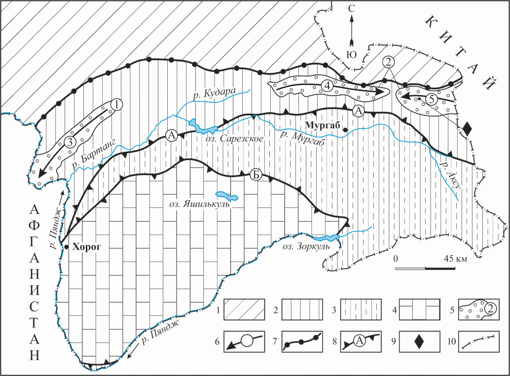 Фиг. 1. Положение Черногорского месторождения в тектонической структуре Памира. Тектоническая схема Б.П. Бархатова (1963) с небольшими изменениями и дополнениями авторов. 1 – герцинская Северопамирская складчатая система. 2–4 – тектонические зоны в киммерийской складчатой системе Южного Памира: 2 – Центральный Памир, 3 – Юго-Восточный Памир, 4 – Юго-Западный Памир; 5 – фундамент Центрального Памира, цифры в кружках (1–2) метаморфические серии: 1 – шипадская, 2 – музкользская; 6 – антиклинории, стрелка указывает направление погружения шарнира: 3 – Ванч-Язгулемский, 4–5 – Музкол-Рангкульский: 4 – Сарымулинская и 5 – Шатпутская антиклинали; 7 – Ванч-Акбайтальский разлом между складчатыми системами; 8 – разломы между тектоническими зонами (А, Б): А – Рушанско-Пшартский, Б – Гунт-Аличурский; 9 – месторождение Черногорское; 10 – государственная граница Республики Таджикистан, на юге и западе проходит по реке Пяндж – верхнему течению р. Аму-Дарья.