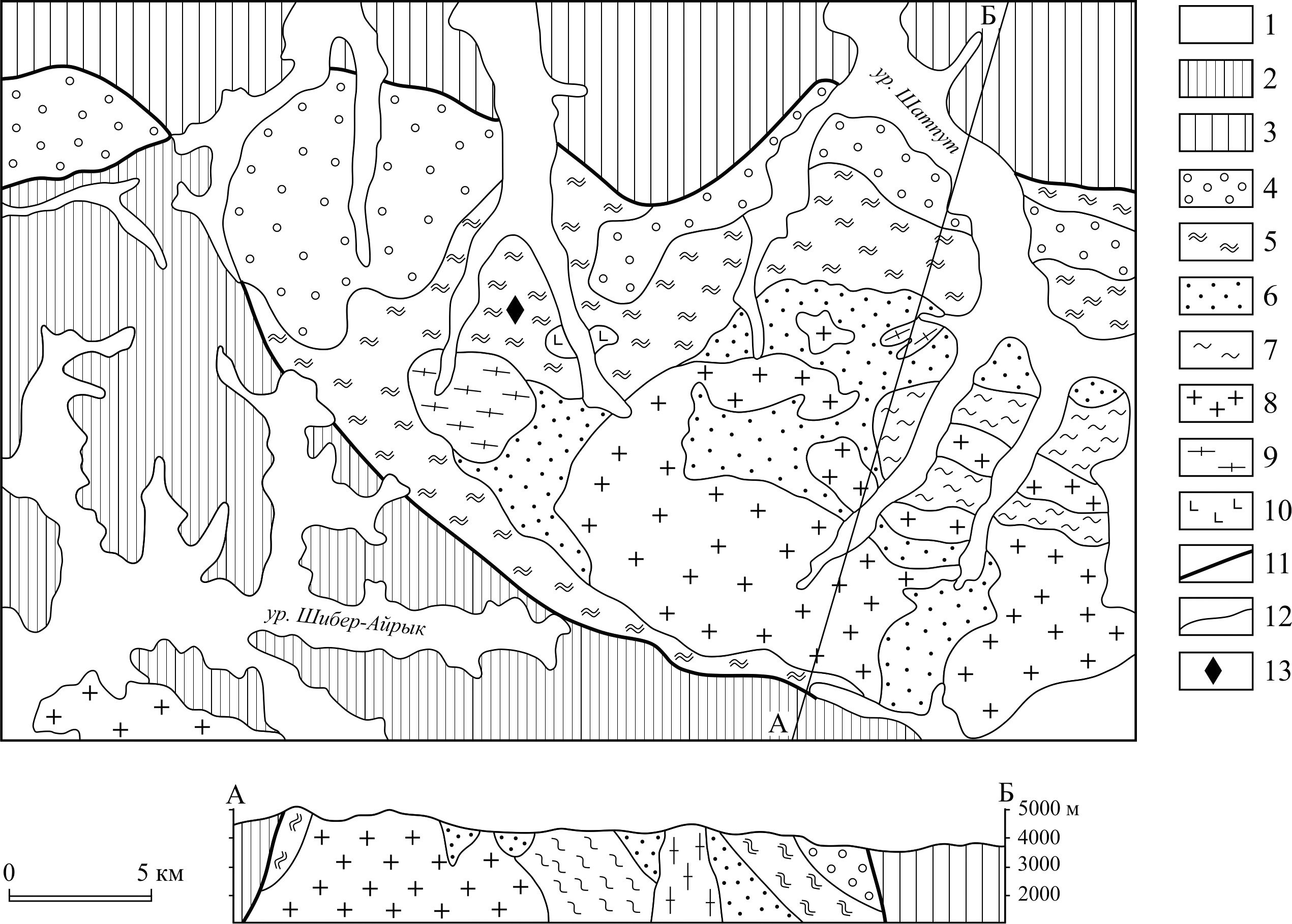 Фиг. 2. Геологическая карта восточной части Музкол-Рангкульского антиклинория – Шатпутского тектонического блока, составлена на основе карты J-43-ХV, масштаба 1:200000 (Мельник, 1964). 1 – рыхлые (QIII + IV) отложения; 2 – МZ (Т–J) группа: известняки, мергели, сланцы, песчаники, конгломераты; 3 – РZ (Є–Р) группа: сланцы, песчаники, кварциты, известняки, мраморизованные известняки, мраморы; 4–7 – музкользкая метаморфическая серия (РR1), свиты: 4 – бурулюкская, 5 – сарыджилгинская, 6 – белеутинская, 7 – сарыджилгинская; 8–10 – интрузивные комплексы: 8 – шатпутский (Р) гранитный, 9 – зорбурулюкский (РR) гнейсо-гранитный, 10 – кукуртский; 11 – глубинные разломы; 12 – контуры геологических тел; 13 – месторождение Черногорское.
